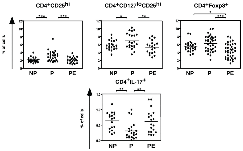 There are reduced suppressive CD4+CD25hi (upper panel, left), CD4+CD127loCD25hi (upper panel, middle) and CD4+Foxp3+ (upper panel, right) T regulatory cells but increased pro-inflammatory CD4+IL-17+ T helper cells (lower panel) in PE women. Blood was collected during the third trimester from pregnant (P) and PE women (PE) and from age-matched non-pregnant women (NP). * p < 0.05, ** p < 0.01 and *** p < 0.0001. From: Santner-Nanan, B., et al. [125].