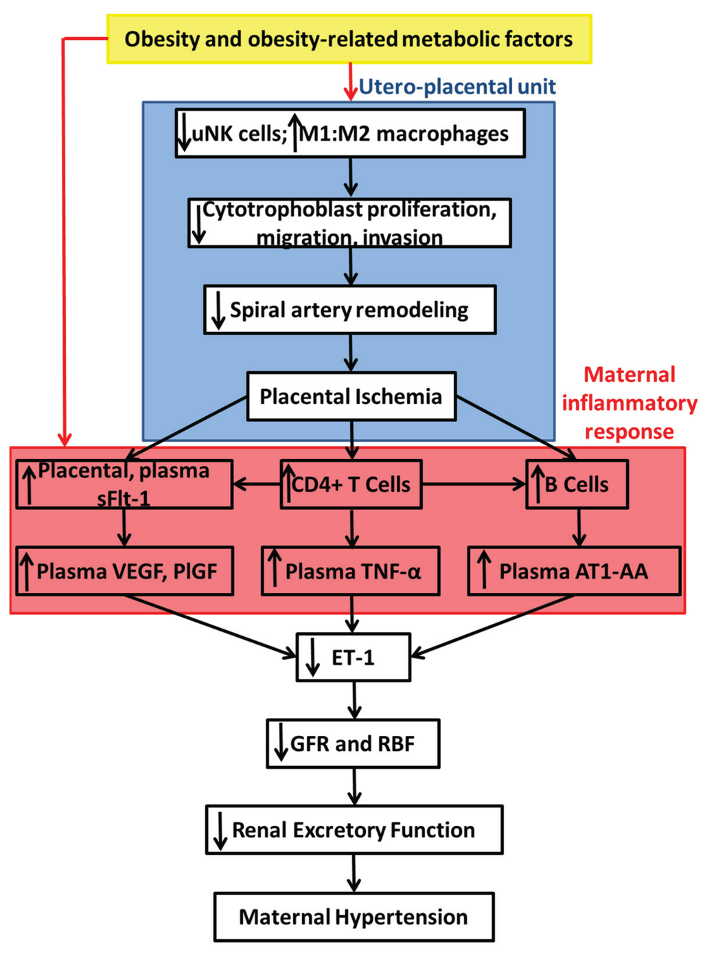 A hypothetic scheme proposing sites where obesity and obesity-related metabolic factors such as high levels of leptin, cholesterol, fatty acids, insulin and/or glucose exaggerate the cascade of events in the utero-placental unit leading to the development of placental ischemia (highlighted by the blue box) and placental ischemia-induced maternal inflammatory responses (highlighted by the red box) culminating in an augmented placental ischemia-induced maternal hypertensive response in obesity.