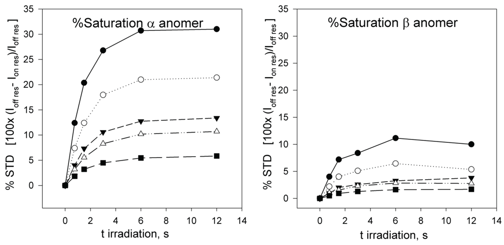 The prerequisite for this type of analysis is the existence of a significant difference between the relative STD signal (ratio of signal in the difference spectra and signal in the off-resonance spectra) of the α and the β anomer, which is fulfilled (Figure 1, right). This clearly observable difference between both anomers (1.1% and 0.5% STD for α and β, respectively at 280 K and with 0.75 s irradiation) makes it possible to quantify the binding affinity of each anomer.