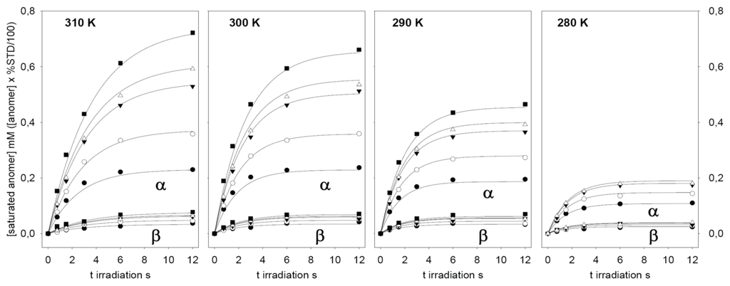 For every temperature (280 K, 290 K, 300 K and 310 K) and 2FDM concentration (0.96; 1.94; 4.14; 5.57 and 12.1 mM) the corresponding saturation time course (0.75, 1.5, 3, 6 and 12 s) data series of formal concentrations of saturated anomers, α* and β* were obtained from the experimental percentages of saturation of each anomer: