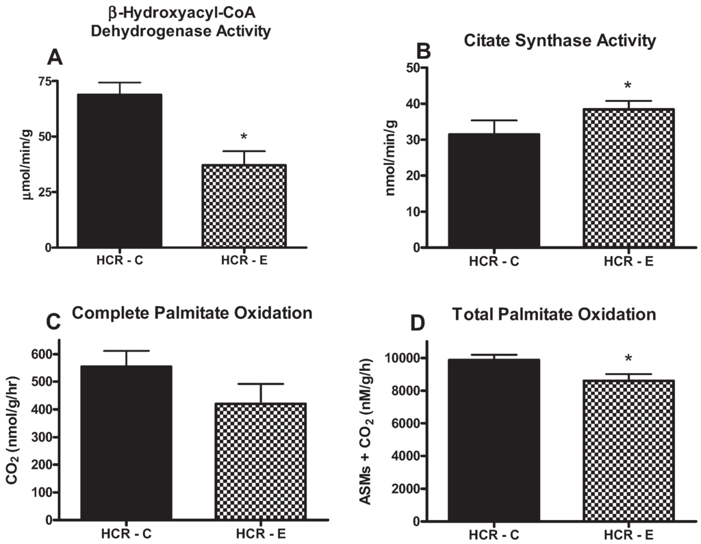 Ethanol consumption significantly reduced total palmitate oxidation (CO2 + ASMs; p = 0.03), but did not lower complete palmitate oxidation to CO2 (Figure 2). This may be explained by lower β-HAD activity, the rate-limiting step in fatty acid oxidation, which was also statistically lower in HCR-E animals (p = 0.01) (Figure 2). However, citrate synthase activity was significantly elevated in the HCR-E group (p < 0.05, Figure 2). Taken together, these data suggest reduced hepatic fatty mitochondrial function as a mechanism for hepatic steatosis in the HCR-E animals.