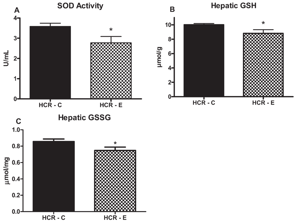 In order to examine the impact of chronic ethanol consumption on antioxidative parameters in the liver of the HCR rats, we assessed hepatic SOD activity, GSH and GSSG concentrations (Figure 3). Ethanol intake significantly reduced hepatic SOD activity and also concentrations of both reduced and oxidized glutathione compared with the HCR-C animals (p < 0.05) (Figure 3).