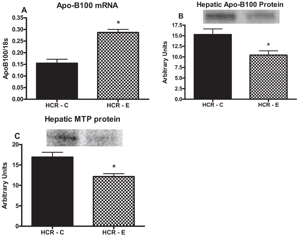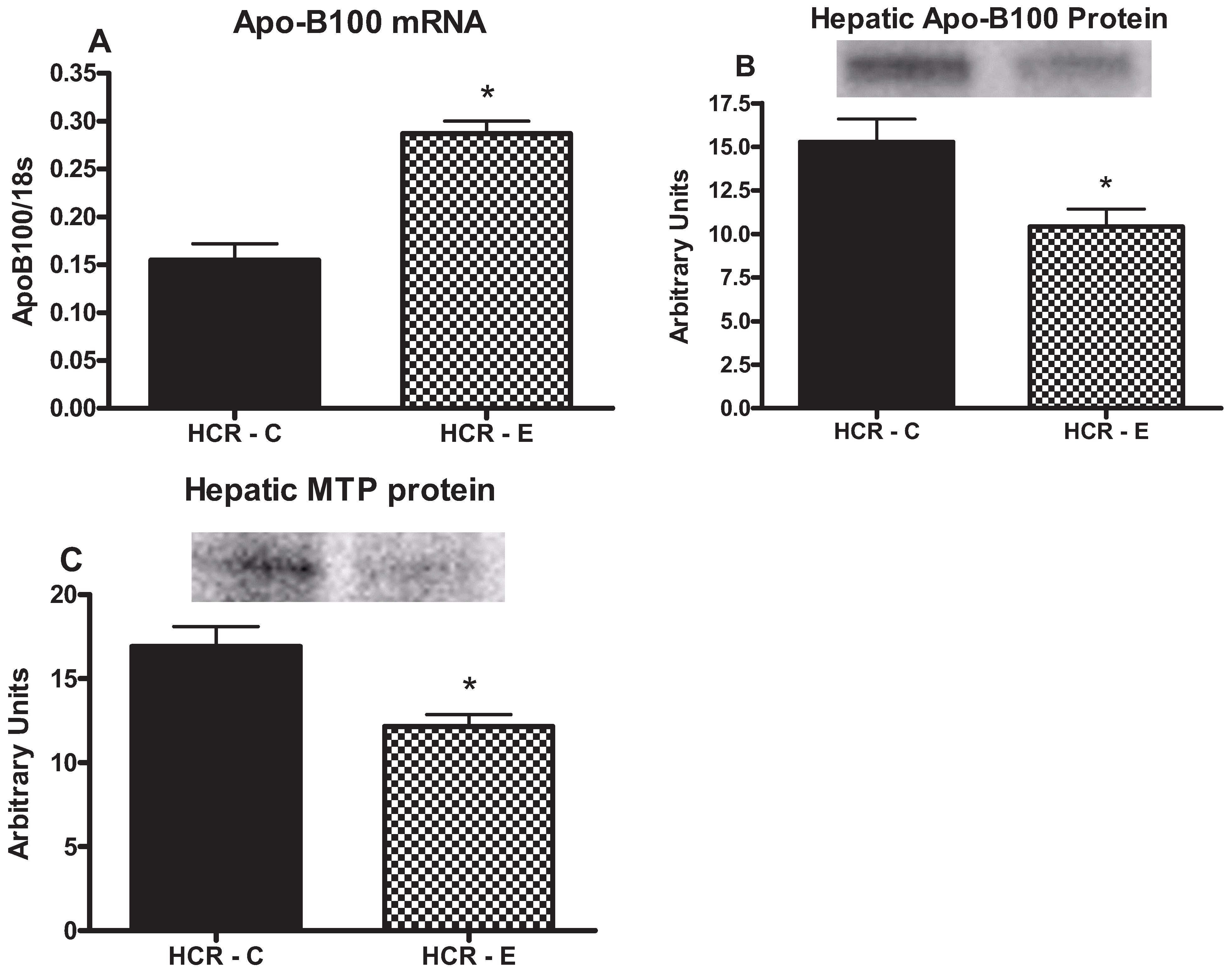 To assess the effects of chronic ethanol intake on markers of hepatic TG export, we examined the protein content of MTP, the rate limiting step in hepatic TG export from hepatocytes (Figure 4) and apoB-100 mRNA and protein content, which accepts TGs from MTP and the newly formed lipoprotein is then excreted from the hepatocyte. The addition of ethanol to HCR rats decreased both the hepatic apoB-100 and MTP protein content (p < 0.05, Figure 4). However, the level of apoB-100 mRNA was significantly increased (p < 0.05).