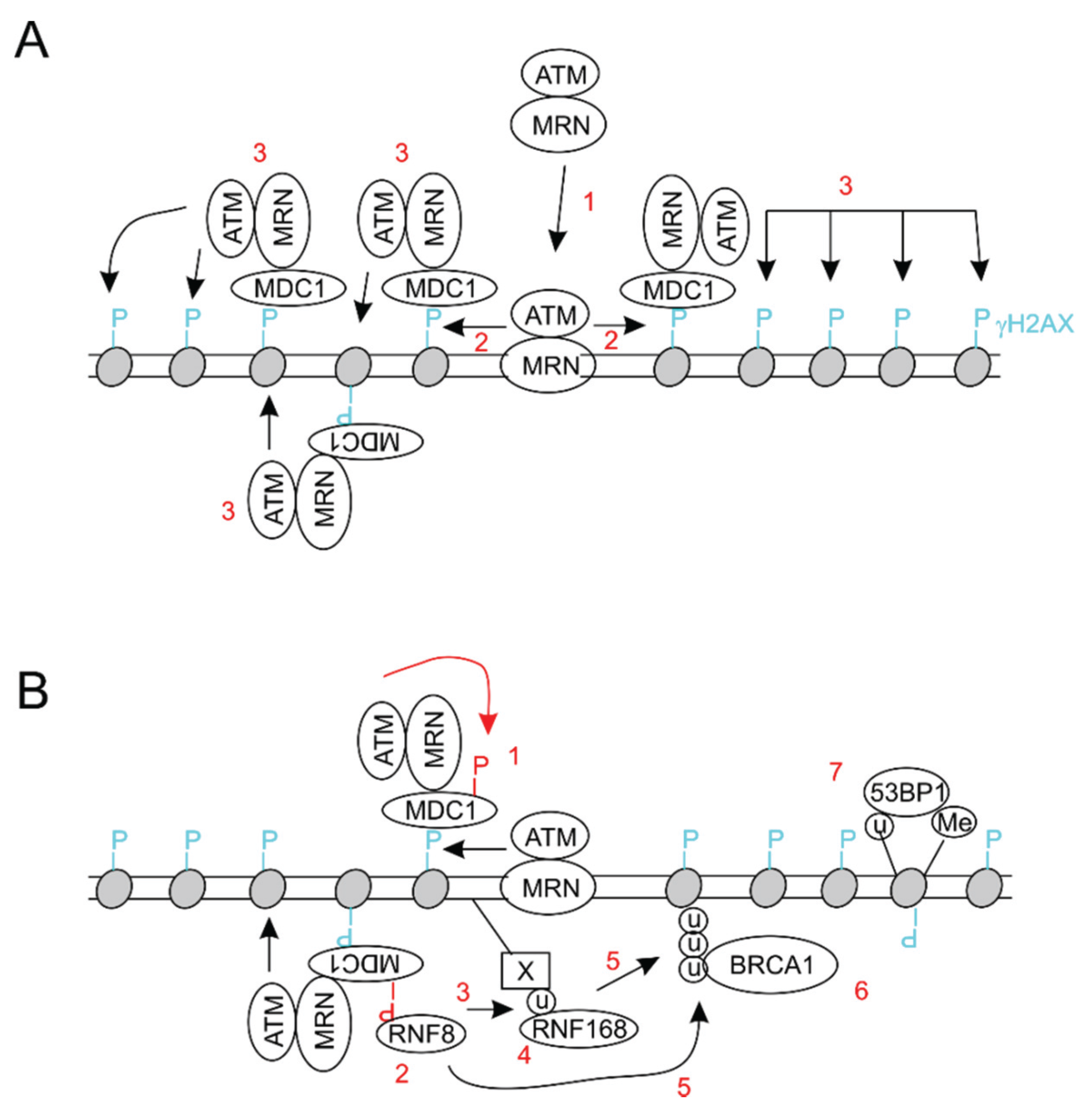 - Stucki, M.; Jackson, S.P. MDC1/NFBD1: A key regulator of the DNA damage response in higher eukaryotes. DNA Repair 2004, 3, 953–957. [Google Scholar] [CrossRef] [PubMed]