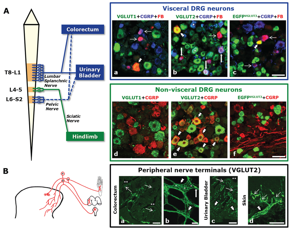 (A) (Left panel) Schematic diagram showing the spinal cord and the dorsal root ganglia (DRG) levels involved in the formation of the lumbar splanchnic, pelvic, and sciatic nerves. Colorectum and urinary bladder are examples of visceral pelvic organs receiving dual innervation by the lumbar splanchnic and pelvic nerves. Note that, for clarity, only L4–5 DRGs are depicted as supplying the sciatic nerve and innervating non-visceral tissues in the hindlimb (even though a small contribution of L6 is also common). (Top right panel) Fluorescence micrographs of DRG sections incubated with calcitonin gene-related peptide (CGRP) and vesicular glutamate transporter-1 (VGLUT1), VGLUT2, or EGFP antisera (EGFP is used as a reporter gene of VGLUT3) and where labeled urinary bladder-projecting neurons can be detected by their content of the retrograde tracer fast blue (previously injected into the subserosal space). Some urinary bladder neurons express VGLUT1 or EGFPVGLUT3 (double arrowheads in a, c); many others only express calcitonin gene-related peptide (CGRP) (thin arrows in a, c). In contrast, VGLUT2 is commonly expressed by urinary bladder neurons (double arrowhead and thick arrows in b), often along with CGRP (thick arrows in b). Bottom right panel: Fluorescence micrographs of L4-5 DRG sections incubated with CGRP and VGLUT1, VGLUT2, or EGFP antisera. Many neurons express VGLUT2, in most cases coexpressing with CGRP (double arrowheads in e). VGLUT1 and VGLUT3 appear more modestly expressed, and virtually never in association with CGRP (d, f). Many VGLUT1-, VGLUT2- and EGFPVGLUT3-only visceral and non-visceral DRG neurons can also be seen (d–f). (B) Left panel: Schematic diagram showing three representative DRG neurons projecting towards visceral organs (urinary bladder and colorectum) or the hindpaw (the central projections of these neurons and their termination (widespread distribution for visceral endings; narrow distribution for cutaneous endings) in the dorsal horn are also depicted). Right panel: (double asterisk indicates visceral organ lumen) The profuse VGLUT2 expression in nerve terminals reaching the colorectum (a, b), the urinary bladder (c) and the hindpaw glabrous skin (d) is shown. Many nerve terminals in the colorectal mucosa (thin arrows in (a) as well as myenteric plexus (double arrowheads in b) express VGLUT2. Within the myenteric plexus islets, several neurons lacking VGLUT2 can be observed (single asterisks in b), although occasional neurons expressing the transporter can be detected (thick arrow in b). In the urinary bladder, a profuse VGLUT2-expressing neuropil is detected both in muscular (double arrowheads in c) and mucosal layers (thin arrows in c). Finally, the skin is also provided with abundant nerve terminals expressing VGLUT2 (thin arrows in d) stemming from thick nerve bundles (double arrowhead in d). Scale bars: 50 µm (A: a–f; B: b); 100 µm (B: d); 200 µm (B: a, c). (Immunohistochemical techniques used in A: a–f and B: a–c are the same as in [7,8,9]; Figure B, subfigure d has been partially modified (with permission) from [9]).