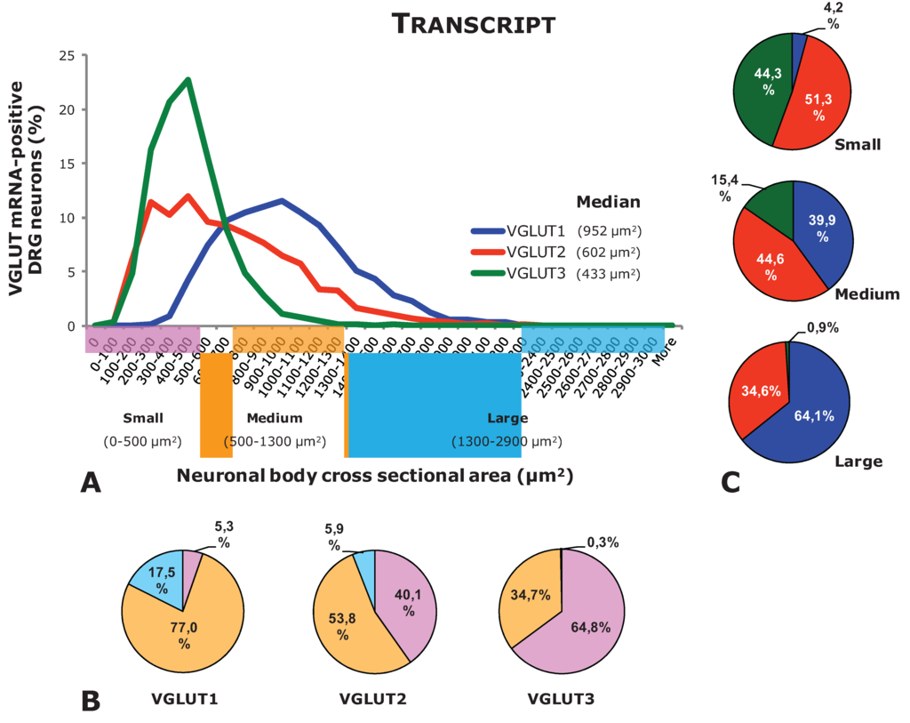 Neuronal size distribution of DRG neurons positive for VGLUT1-VGLUT3 mRNA (based on data from [13]). (A) Histogram showing the size distribution of L4-5 DRG neurons expressing the transcript of VGLUT1, VGLUT2, or VGLUT3 (Percentages were obtained comparing cell soma size at each value in “X” with the total number of neurons measured for each VGLUT). (B) Pie charts showing the percentage of small, medium-sized, and large DRG neurons relative to each VGLUT. (C) Pie charts showing the percentage of VGLUT1-, VGLUT2-, or VGLUT3-positive DRG neurons relative to each neuronal size.