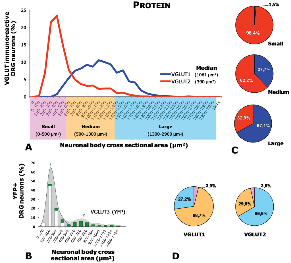 Neuronal size distribution of DRG neurons positive for VGLUT1-VGLUT3 protein (based on data from [9]). Figure in B was taken from [31] and partially modified with kind permission of Prof. Sandkühler). (A) Histogram showing the size distribution of L4–5 DRG neurons immunoreactive for VGLUT1 or VGLUT2 (Percentages were obtained comparing cell soma size at each value in “X” with the total number of neurons measured for each VGLUT). (B) Histogram showing the size distribution of Yellow Fluorescent Protein-positive (used here for identification of VGLUT3) DRG neurons. (C) Pie charts showing the percentage of small, medium-sized, and large DRG neurons relative to VGLUT1 or VGLUT2. (D) Pie charts showing the percentage of VGLUT1- or VGLUT2-positive DRG neurons relative to each neuronal size.