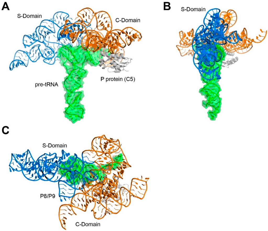 Structure of a bacterial RNase P holoenzyme in complex with its pre-tRNA substrate. (A) Front view; (B) side view; and (C) top view. PDB ID: 3Q1Q [15]. All molecular graphics were generated with PyMol [18].