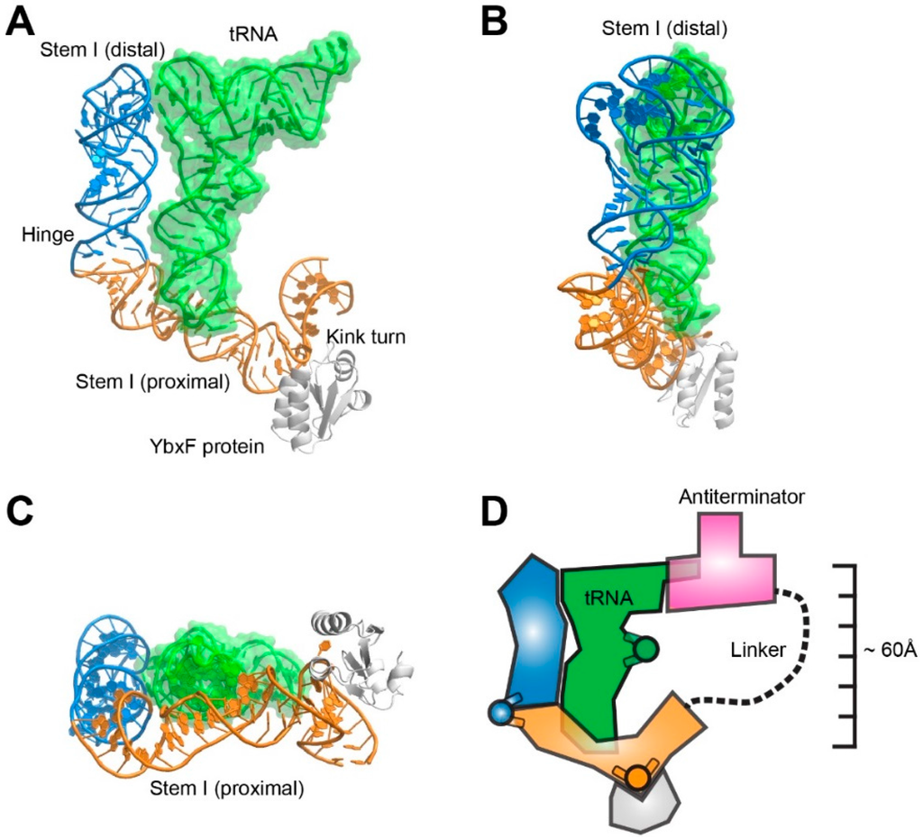 At the proximal end of most T-box Stem I domains is a conserved Kink turn (K-turn) [34,35,36]. This is a widespread RNA structural motif that bends the helical trajectory of the RNA by 120° and is the binding site for proteins such as YbxF (of the L7Ae family) [37]. It remains unclear why the K-turn is required for T-box function in vivo [35], as it does not appear to contribute to Stem I-tRNA binding [26,33]. The crystal structure of the O. iheyensis Stem I-tRNA complex suggests that, although the K-turn is located in the Stem I domain, its role may be to facilitate coupling of initial tRNA recognition by this domain and subsequent evaluation of tRNA aminoacylation status by the Antiterminator domain [26]. The K-turn, and the proteins that stabilize its characteristic sharp kink may be responsible for redirecting the path of the polynucleotide chain and projecting the 3' Antiterminator domain of the T-box to the vicinity of the tRNA 3' end. The tripartite recognition of the tRNA elbow, anticodon, and 3' end by a single T-box RNA calls for a U-shaped overall architecture [19,26,27]. Since coaxial helical stacks dominate RNA structures, multiple bends are required to construct a shape to track the tRNA. The mild bend of the Stem I hinge and the sharp kink of the K-turn together contribute to this in the case of T-box riboswitches.