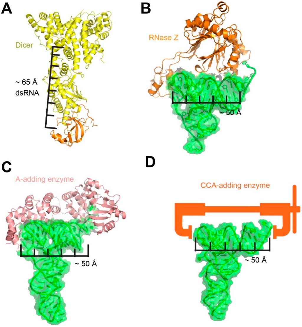 Selected examples of proteins measuring distances on RNA structures. (A) Dicer measurement of double-stranded RNAs (dsRNAs). PDB ID: 2FFL [72]; (B) RNase Z measurement of pre-tRNAs. PDB ID: 4GCW [74]; (C) A-adding enzyme measurement of 3'-CC-containinng pre-tRNAs. PDB ID: 4X0B [75]; and (D) CCA-adding enzyme acting as a molecular vise that mechanically inspects tRNA structural integrity [76].