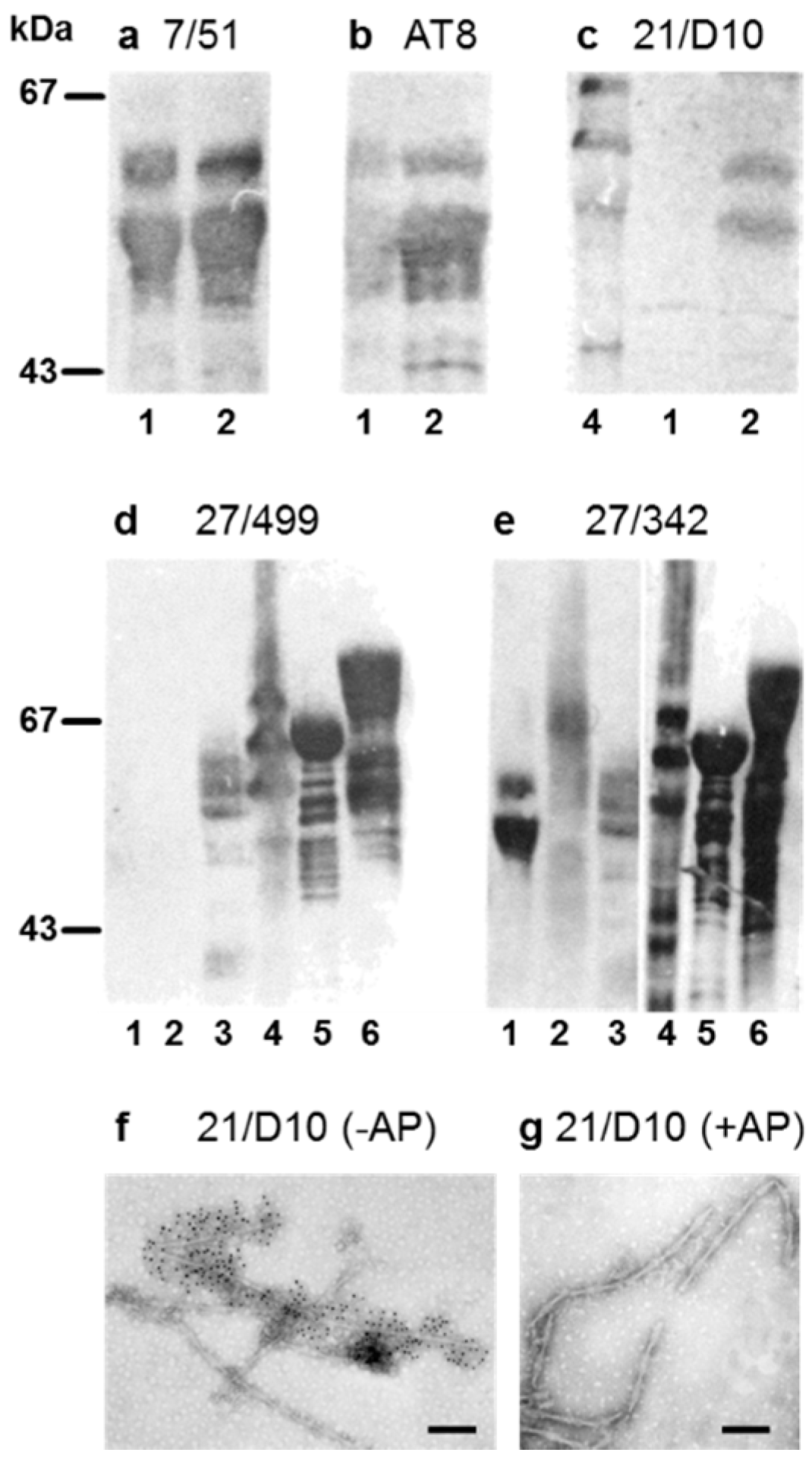 Immunoreactivity profile for tau antibodies. (a) The mAb 7/51 recognised tau proteins isolated from the brain of neonatal rat both before (lane 1; NT) and after (lane 2; NTP) hyperphosphorylation in vitro; (b) The mAb AT8 recognised endogenously phosphorylated tau (lane 1), the extent of which is increased following further in vitro phosphorylation (lane 2); (c) The mAb 21/D10 detected a phosphorylation-dependent epitope which is absent (lane 1) in endogenously phosphorylated neonatal tau (lane 1), but present following in vitro hyperphosphorylation (lane 2), and is also present in sarkosyl-insoluble tau protein isolated from AD brain tissue (lane 4); (d) The human tau-specific mAb 27/499 did not recognise neonatal tau isolated from rat before (lane 1) or after phosphorylation in vitro (lane 2), but recognised tau protein isolated from the brain of normal adult human (lane 3) and in the sarkosyl-insoluble tau extract from AD brain (lane 4), and the recombinant human tau both before (lane 5; T40) and after (lane 6; T40P) hyperphosphorylation in vitro; (e) In contrast, mAb 27/342 recognised neonatal rat tau both before (lane 1) and after (lane 2) hyperphosphorylation in vitro, but otherwise had a similar immunoreactive profile to mAb 27/499; (f,g) Non-Pronase treated PHFs from AD brain tissue were immunodecorated by mAb 21/10, as visualized by gold particles. The latter immunoreactivity was abolished by prior treatment of PHFs with alkaline phosphatase (AP).