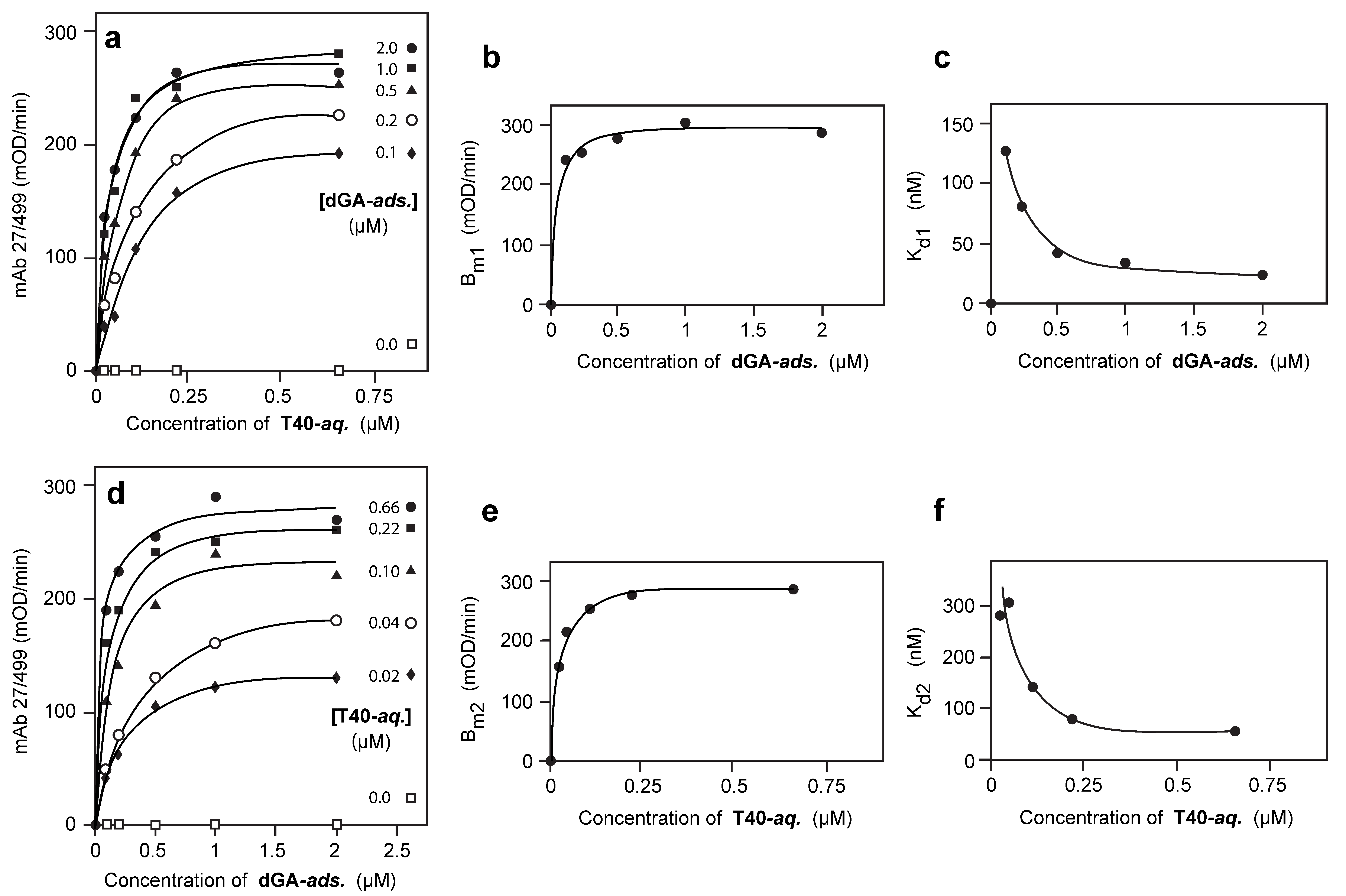 Since the binding data exist as a two-dimensional matrix, it is possible to examine binding as a function of the plating concentration of dGA for any given concentration of T40 in the aqueous phase (Figure 2d). The binding data could again be approximated by a similar set of relationships to those shown above. That is, for any fixed concentration of aqueous T40, binding can be expressed as a function of the concentration of solid-phase dGA according to the standard relationship: