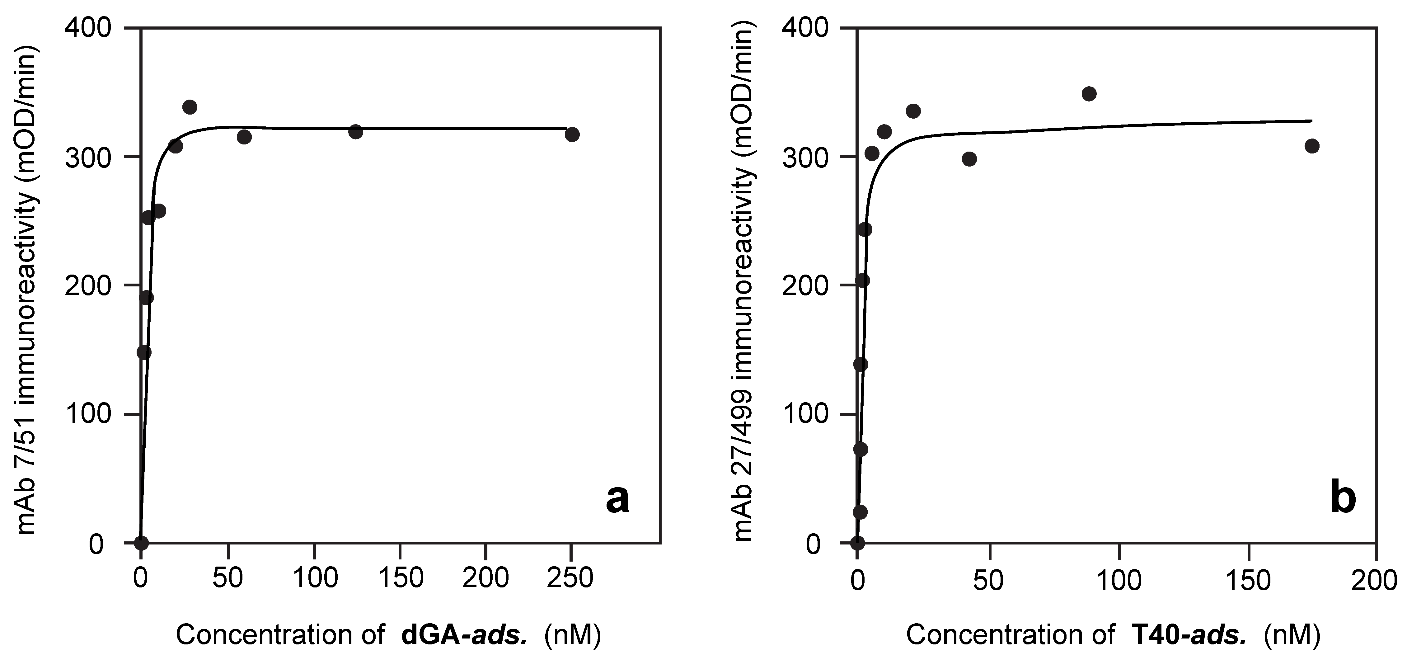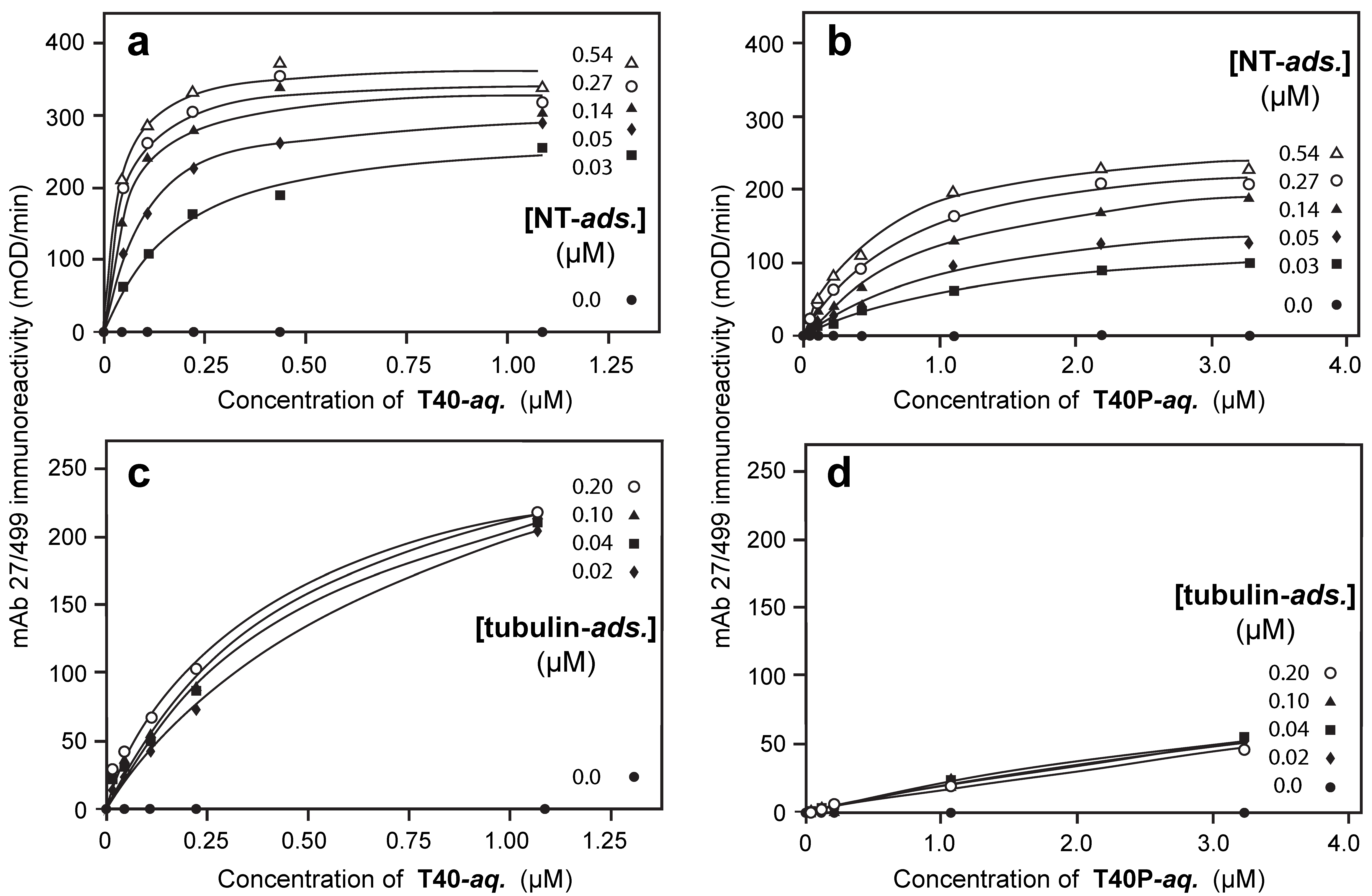 As seen in Figure 2a, for any fixed plating concentration of adsorbed dGA, the binding data for aqueous T40 detected by N-terminal tau immunoreactivity (mAb 27/499) can be approximated by the standard relationship: