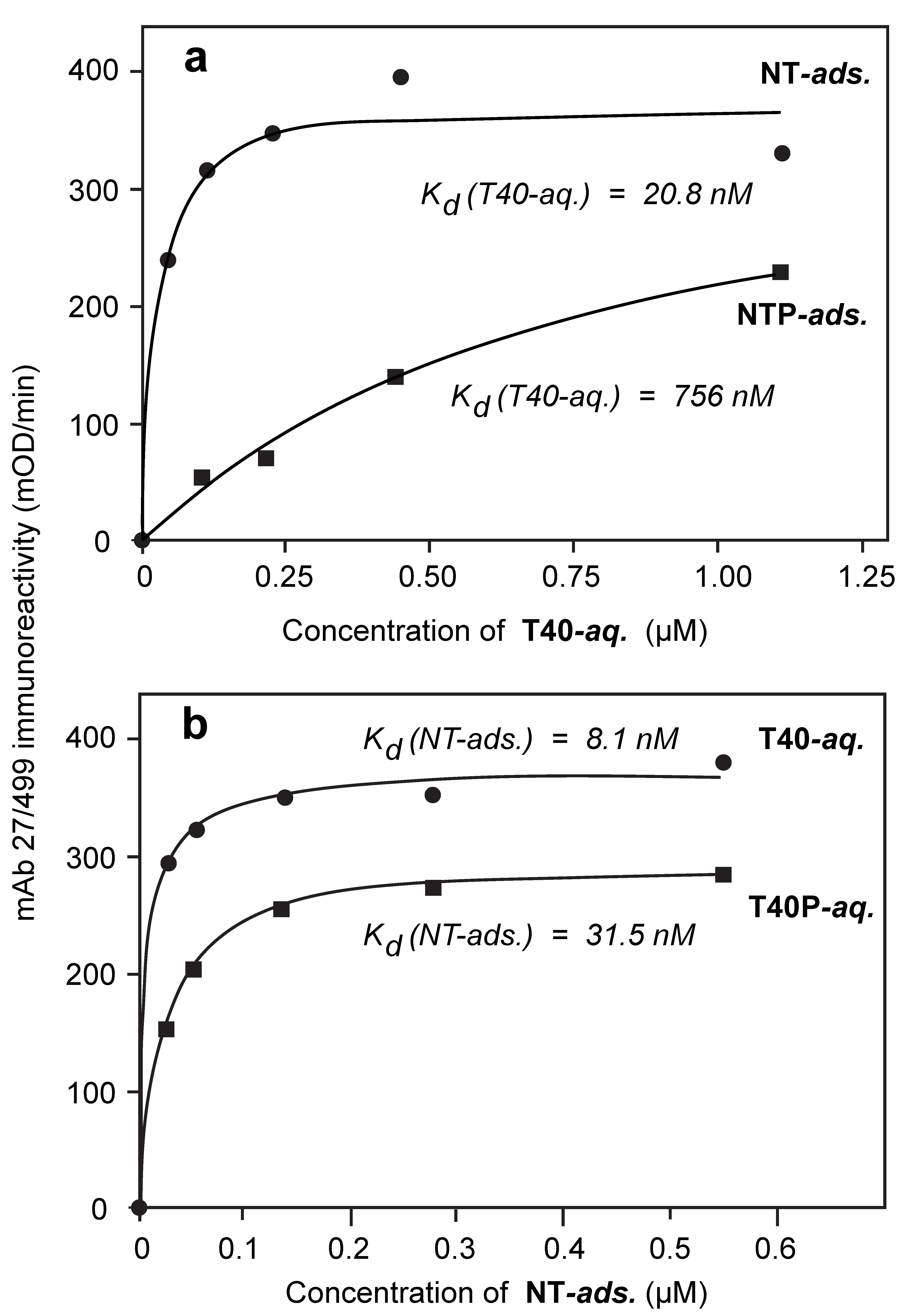 When endogenously phosphorylated NT was incubated in the aqueous-phase with adsorbed dGA, no binding to adsorbed dGA was detected even at concentrations as high as 1 µM (data not shown). However, when NT was adsorbed in the solid-phase of the assay, the binding affinity of T40 was experimentally indistinguishable from its binding to adsorbed dGA (Figure 2a and Figure 4a; Table 2; Kd,Aqueous(NT/T40) = 20.8 ± 10.5 nM; p = 0.511). Therefore, adsorption of NT to the solid-phase substrate overcomes the inhibitory effect of the endogenous state of phosphorylation in NT hindering its binding to the repeat domain tau fragment in the solid phase and provides the same binding affinity for T40 as the dGA repeat domain fragment.