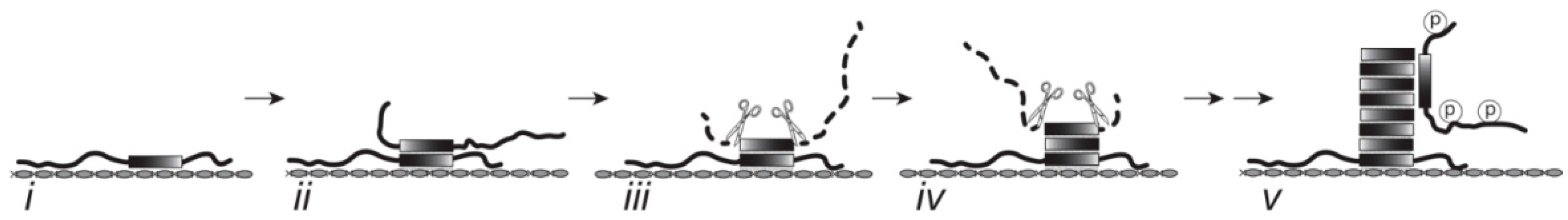 Schematic representation of tau-tau binding. (i) Tau is initially captured by binding to a solid-phase substrate. The identity of the endogenous substrate in the aging brain is unknown, but may be formed from macromolecular complexes which escape normal endosomal/lysosomal processing with advancing age; (ii) The tau bound to a solid-phase substrate is able to capture further full-length tau through a tau-tau binding interaction which has greater affinity (lower energy) than the physiological tau-tubulin binding interaction; (iii) This locks the repeat domain into a proteolytically stable configuration such that proteolytic cleavage of the N- and C-termini leaves behind a characteristic tau fragment restricted to the repeat domain, the core tau unit of the PHF; (iv) The oligomeric form of truncated tau is able to propagate capture and proteolytic processing of further tau, and repeated cycles of binding and proteolysis result in accumulation of PHF-core tau; (v) It is only at a later stage that non-proteolysed, full-length tau molecules are added and these become secondarily phosphorylated. The optimal points of pharmaceutical intervention are therefore blocking the binding of tau to the initiating endogenous substrate or blocking the propagation of tau aggregation cascade with tau aggregation inhibitors.