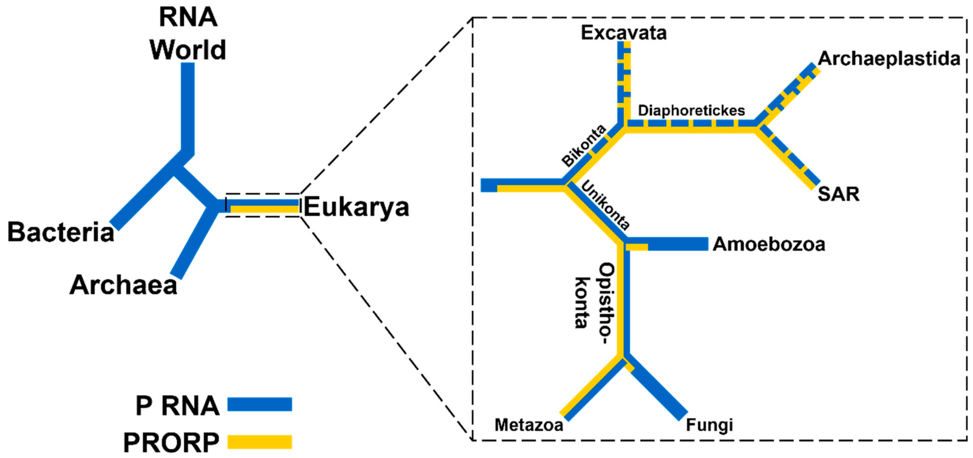 Distribution of RNase P enzymes across evolutionary lineages. Presence of a P RNA (blue) or PRORP (yellow) is indicated. Left: RNA-based RNase Ps are found in all domains of life and are proposed to have evolved from an RNA predecessor lacking protein components. PRORPs exist only in Eukarya and likely evolved after the divergence with Archaea. Right: Distribution of RNase Ps in Eukarya using the five supergroup model (aspects of the branching order remain controversial) [12,13]. PRORPs are found in four supergroups: Excavata, Archaeplastida, SAR [Stramenopiles, Aveolata, and Rhizaria], and Opisthokonta, but not in the fifth: Amoebozoa [11]. Dashed blue or yellow lines indicate that some clades within the supergroup lack RNase P RNA or PRORP sequences, respectively.