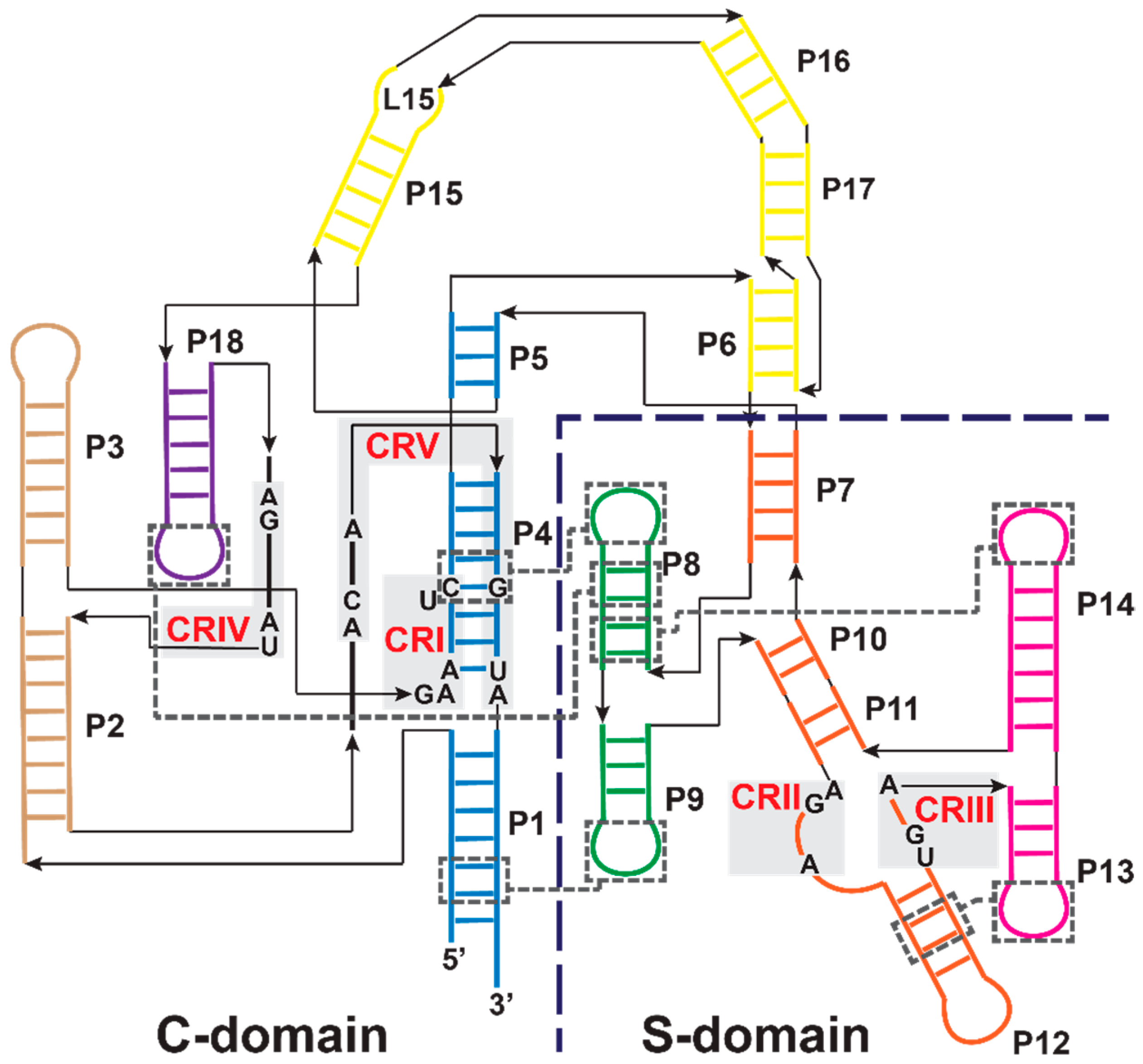 The secondary structure of type A RNase P RNA from T. maritima (adapted with permission from [21]) [22,23]. Individually-folding catalytic (C)- and specificity (S)-domains are divided by the dashed line. Conserved regions (CRI–V, red) are indicated by gray shading and numbered in order of occurrence from the 5’ end [4]. Tertiary interactions in the T. maritima P RNA are indicated by dashed gray boxes and lines. Helices are colored by coaxial-stack and are numbered as P1–P18 in order of occurrence from the 5’ end. The C-domain includes P1/P4/P5 (blue), P2/P3 (brown), P6/P15/P16/P17 (yellow,) and P18 (purple). The S-domain includes P7/P10/P11/P12 (orange), P8/P9 (green), and P13/P14 (pink).