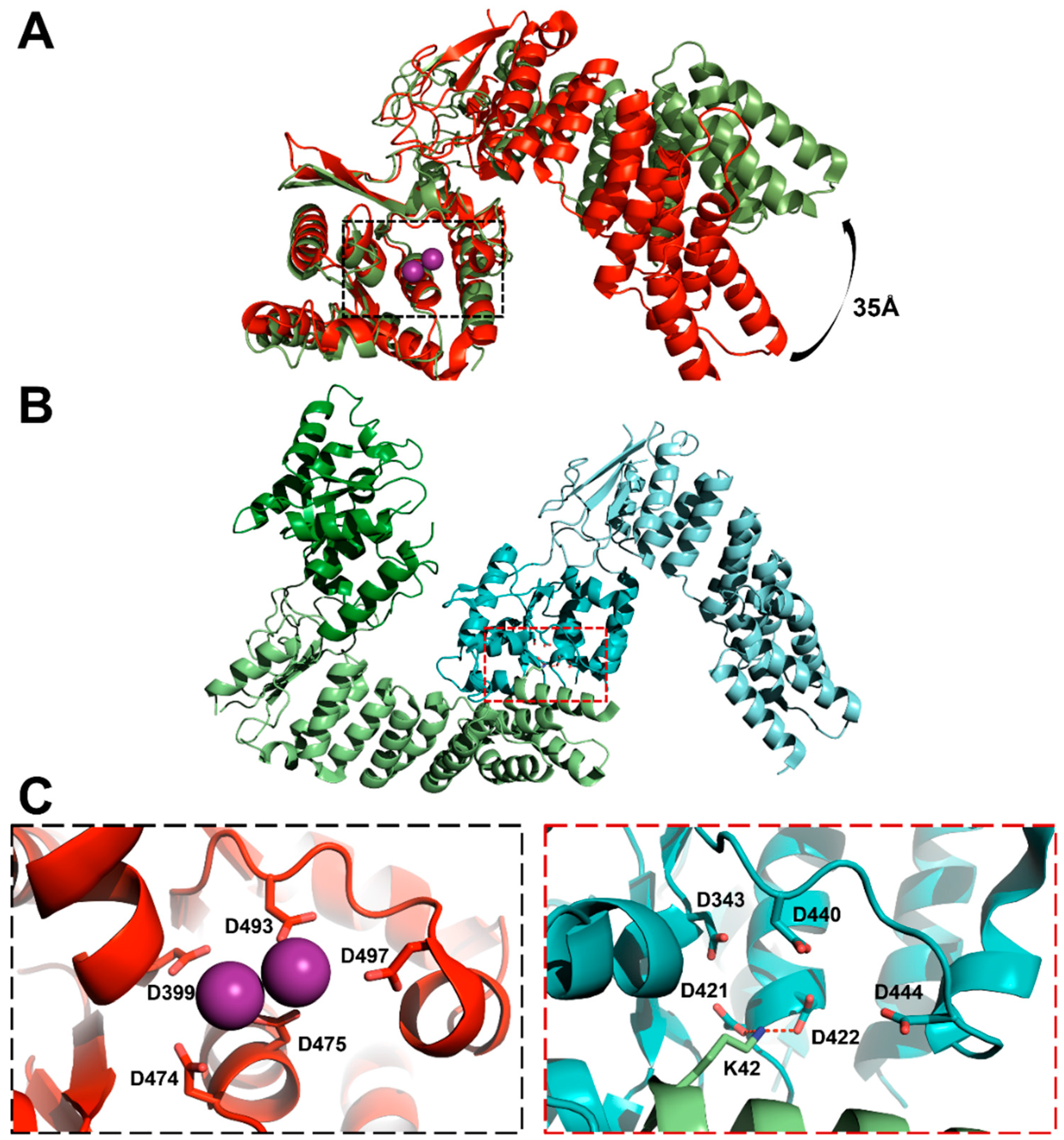 Crystal structures of AtPRORP1 (PDB 4g24) and AtPRORP2 (PDB 5diz) [64,103]. (A) Three-dimensional alignment of AtPRORP1 and AtPRORP2 structures via their active sites (dashed box). PRORP1 (red) topology includes the NYN metallonuclease domain bound to Mn2+ (purple spheres). PRORP2 (green) is in a more “open” conformation, resulting in a ~35 Å difference in the position of the first PPR helix; (B) AtPRORP2 crystallization dimer (left), with subunits labeled in green and cyan (NYN domains in brighter colors); (C) Expanded views of the dashed boxes in panel A (left) or B (right). The AtPRORP1 active site (left) includes four fully-conserved aspartates and one partially-conserved aspartate (sticks). Close-up of intersubunit interaction (right) between AtPRORP2 molecules, with active site aspartates of one molecule interacting with Lys 42 (sticks) of the second (red dashed lines).
