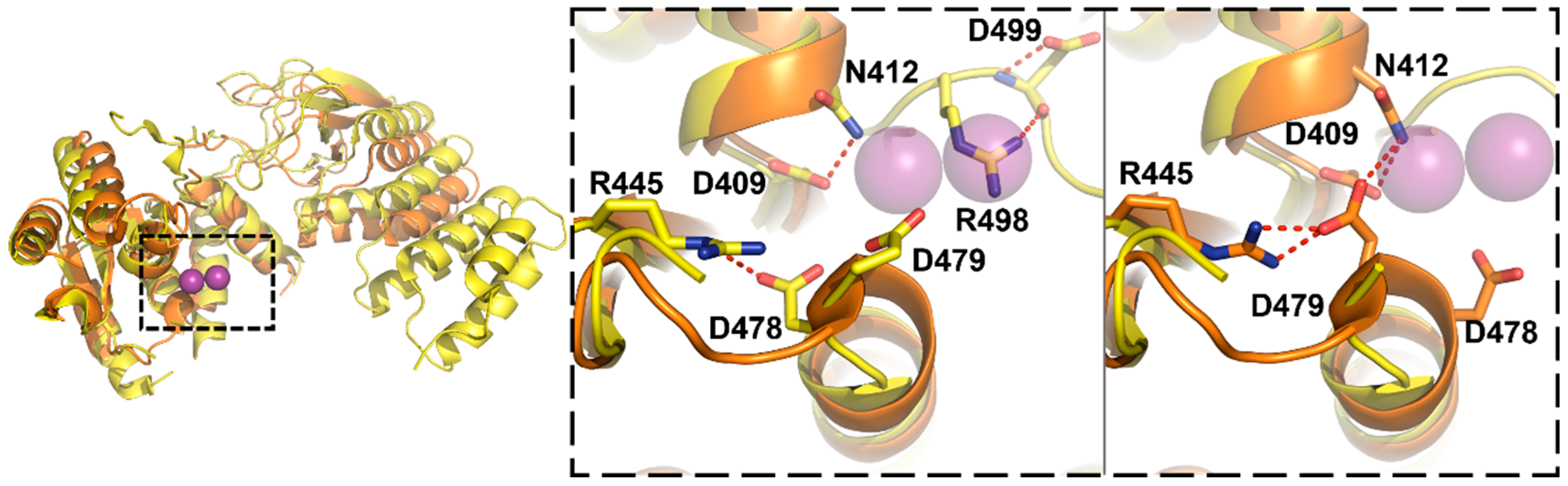 Alignment of two MRPP3 structures (PDB 4xgl, yellow; PDB 4rou, orange) with the AtPRORP1 active site (PDB 4g24, only metal ions shown) [66,69,107]. Left: Alignment of two MRPP3 structures with the PRORP1 active site (purple spheres). MRPP3 NYN residues (4xgl: S361/P362, D409, D479, and D499, or 4rou: residues S361/P362, D409, D478, and D479) were aligned to the equivalent PRORP1 residues. The dashed box is expanded on the right. Middle and Right panels: Dashed box contains the aligned MRPP3 active site residues from 4xgl (middle, yellow) or 4rou (right, orange) with Mn2+ from PRORP1 (transparent purple spheres). Residues with the potential to occlude the metal sites, N412, R445, and R498, are shown if coordinates are available. Hydrogen bonds between residues are shown as dashed red lines.