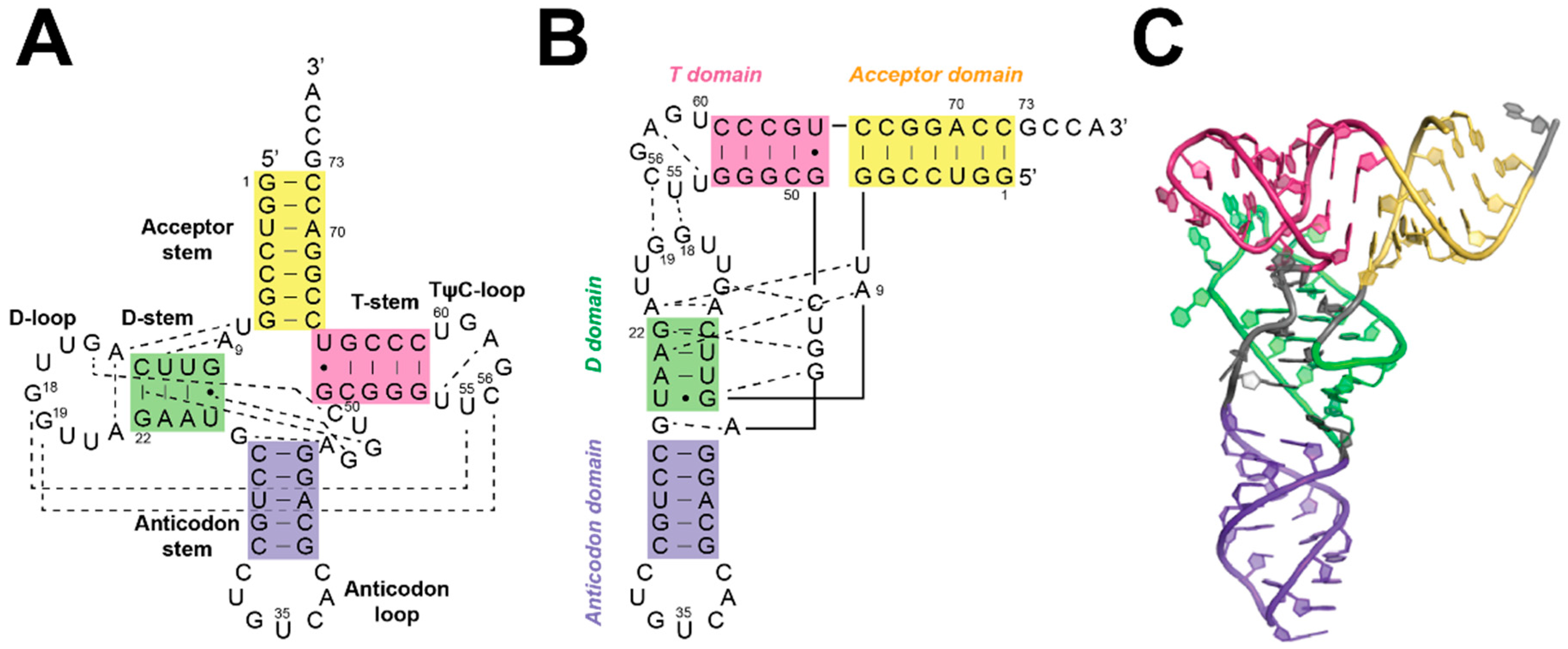 Secondary and tertiary structures of canonical tRNA (adapted with permission from [7]). (A) and (B) Secondary structure of B. subtilis tRNAAsp with tertiary interactions denoted by dashed lines. (C) A crystal structure of an unmodified E. coli tRNAPhe (PDB 3l0u) [161].