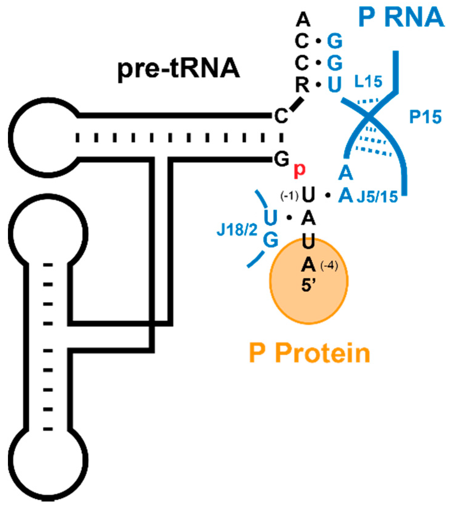 The 1989 Nobel Prize in Chemistry was awarded to Sidney Altman and Thomas Cech “for their discovery of catalytic properties of RNA” [1]. Altman was recognized for determining that the ribonuclease P (RNase P) activity of Escherichia coli originates from an RNA subunit [2,3]. RNase P is a metal-dependent endonuclease that catalyzes phosphodiester bond hydrolysis of precursor transfer RNA (pre-tRNA), generating tRNA with a mature 5’ end, including a 5’ phosphate, and a 5’ leader with a 3’ hydroxyl (Figure 1) [4]. Pre-tRNAs are non-functional in translation and must be processed for protein synthesis to occur [5,6]. Therefore, RNase P plays a key role in cellular homeostasis and survival.