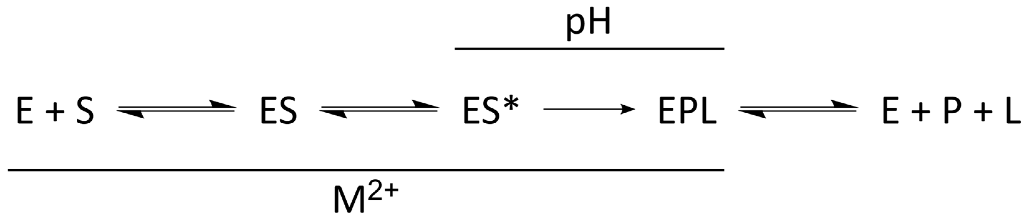 At low pH and under single turnover conditions, the observed rate constant (kobs) increases with a log-linear relationship to pH [112]. The Hill coefficient, nH = 1, is consistent with a single ionization producing the metal-hydroxide nucleophile required for catalysis [112]. This is in contrast to nucleases that utilize a general base, which display nH = 2 [114,115]. The conformational change step becomes rate-limiting at high pH, resulting in a kinetic (rather than thermodynamic) pKa [112]. In the two-step binding mechanism, ES* is stabilized by at least two classes of inner-sphere metal ions [34]. A class of high-affinity divalent cations is required to stabilize the ES* conformer, while a lower-affinity metal ion activates catalysis [32,34,35,116].