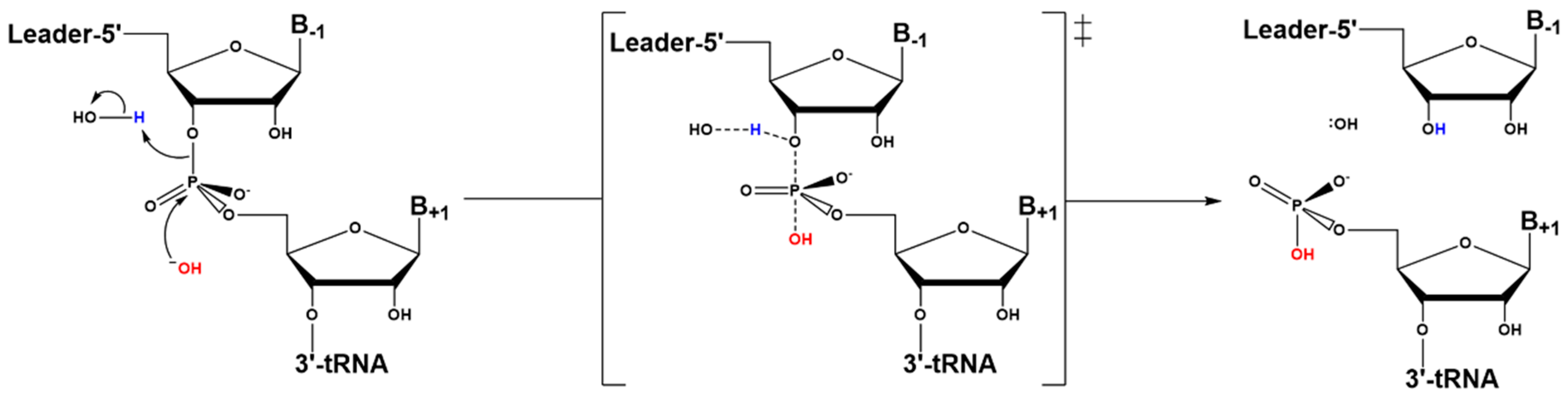 - Harris, M.E.; Pace, N.R. Identification of phosphates involved in catalysis by the ribozyme RNase P RNA. RNA 1995, 1, 210–218. [Google Scholar] [PubMed]