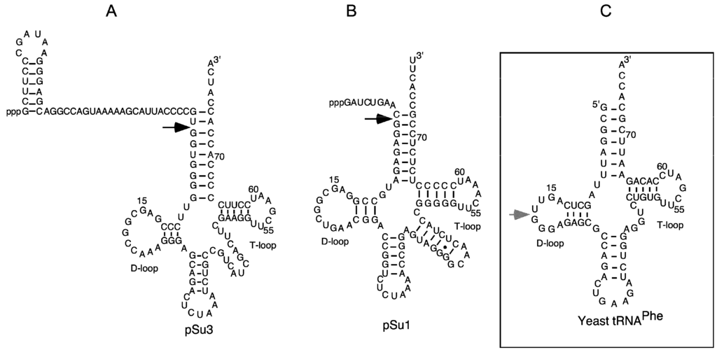 - Loria, A.; Pan, T. Recognition of the T stem-loop of a pre-tRNA substrate by the ribozyme from Bacillus subtilis ribonuclease P. Biochemistry 1997, 36, 6317–6325. [Google Scholar] [CrossRef] [PubMed]