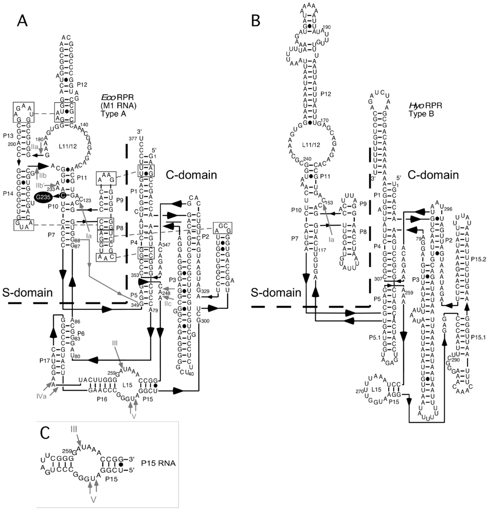 - Kirsebom, L.A.; Trobro, S. RNase P RNA-mediated cleavage. IUBMB Life 2009, 61, 189–200. [Google Scholar] [CrossRef] [PubMed]