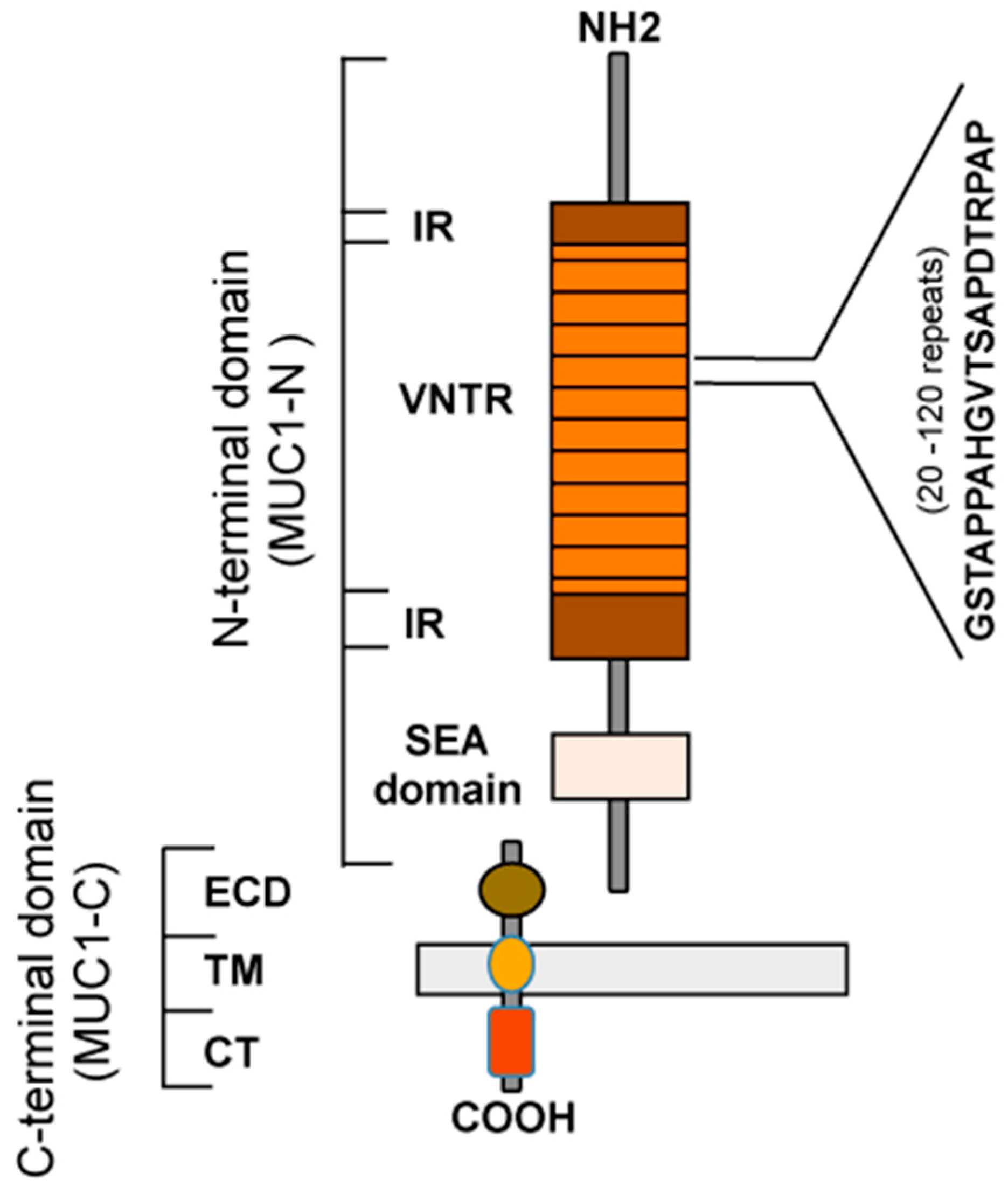 Schematic representation of mucin 1 (MUC1) structure. Abbrevition: CT: cytoplasmic tail; ECD: extracellular domain; IR: imperfect repeat; TM: transmembrane; SEA: sea urchin sperm protein-enterokinase-agrin; VNTR: variable number of tandem repeat.