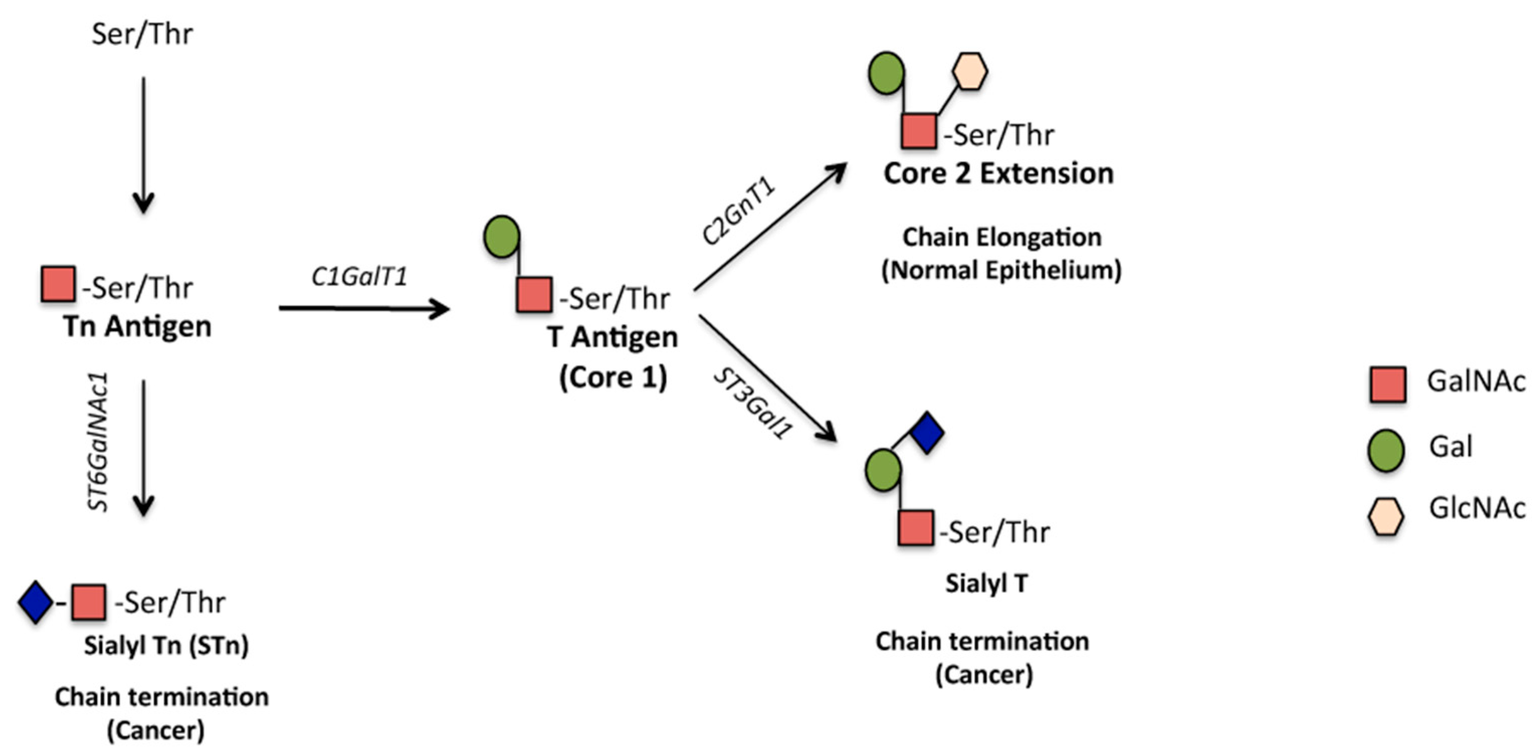Mucin type O-glycosylation is initiated by polypeptide N-acetylgalactosaminyltransferase (GALNT) family members that add N-acetylgalactosamine (GalNAc) to either serines or threonines of PTS domains. The resulting O-linked structure is called Tn antigen. By the transfer of galactosamine (Gal) from UDP-Gal to GalNAc-α-1-R, the glycosyltransferase core 1 synthase, glycoprotein-N-acetylgalactosamine3-beta-galactosyltransferase, 1 (C1GalT1) (or T-synthase) generates the core 1 O-glycan, also named T antigen, which is the precursor of many extended O-glycans. In normal epithelial cells, the enzyme 2-β-1,6-N-acetylglucosaminyltransferase (C2GnT) elongates the core 1 O-glycan by the addition of GlcNAc (Figure 2). In cancer, the O-glycan chains attached to glycoproteins are often truncated and they commonly contain the Tn and T antigens, and their sialylated versions (STn and ST) [18,19]. The altered glycosylation occurring in tumor cells often results from aberrant expression of glycosyltransferases and their substrates that regulate their activity. Lack of C1GalT1 activity results in the exposure of Tn whereas the abundance of STn form is associated with aberrant overexpression of the α6-sialyltransferase ST6GalNAc1 that controls the sialylation of the first sugar GalNac of Core 1 (Figure 2). In breast cancer, the expression of RNA encoding ST6GalNAc1 correlates with sialyl-Tn expression [20]. Overexpression of the Tn form is also associated with somatic mutations in the core 1 β3-Gal-T-specific molecular chaperone, COSMC, gene that encodes a chaperone protein for the Core 1 synthase. The active form of C1GalT1 depends on the coexpression with COSMC, which prevents its aggregation and proteasomal degradation [21]. Depletion of the COSMC gene in vivo in mouse models causes loss of C1GalT1 activity and Tn antigen expression [22]. Epigenetic silencing of the COSMC gene, through promoter hypermethylation, occurs in prostate and other epithelial human cancers and correlates with overexpression of truncated O-glycans as well as C1GalT1 reduced expression [23]. Another enzyme often overexpressed in cancer is the α-2,3-sialyltransferase (ST3GalI) that adds sialic acid to core 1 glycans and is responsible for the abundance of the ST form (Figure 2). In breast carcinoma, ST3GalI expression is elevated when compared to normal or benign tissues and in ductal carcinoma the level of its messenger RNA (mRNA) is related to the grade of the tumor [24]. Overexpression of ST3GalI results in increased sialylation of MUC1 [25].