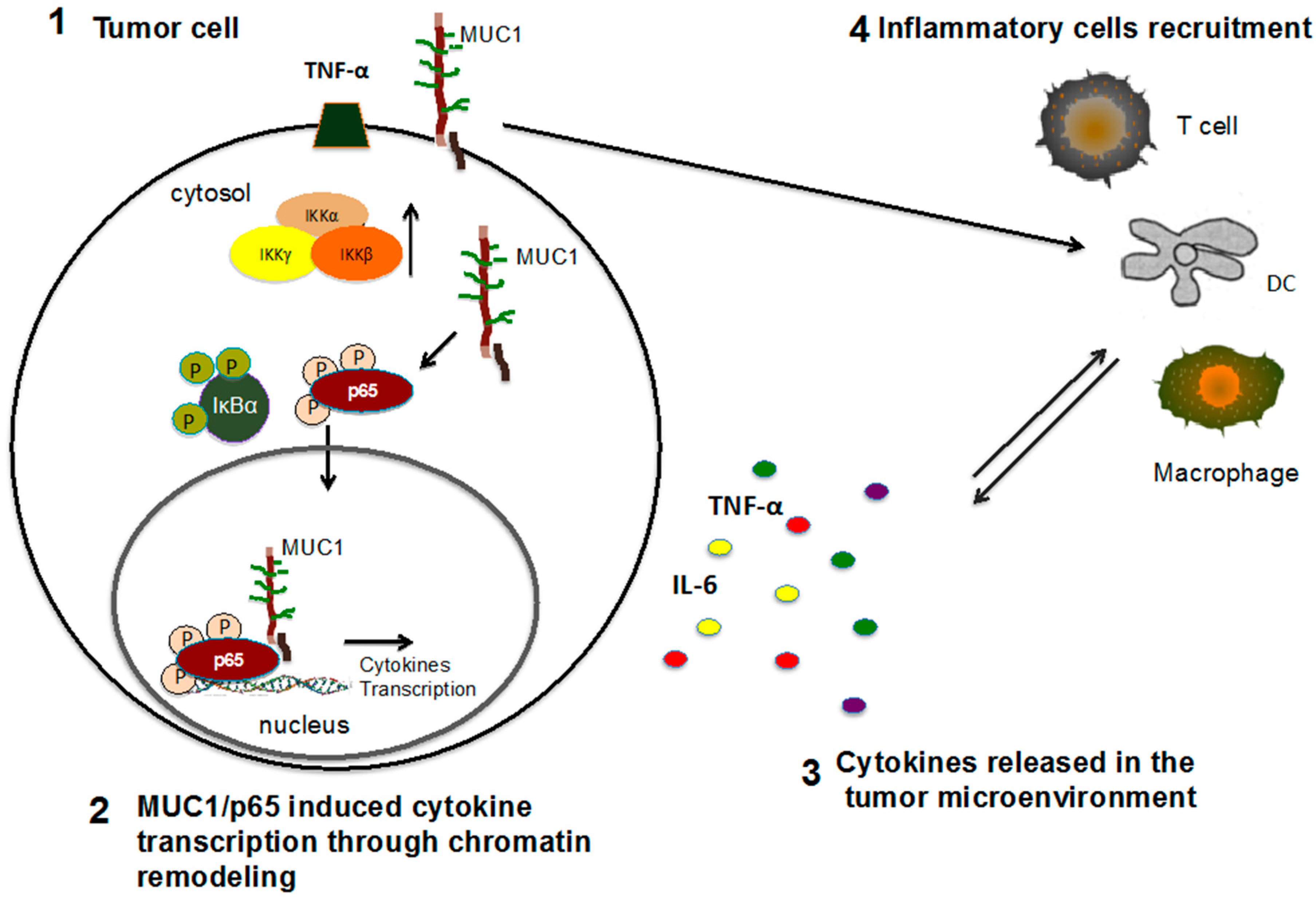 Model of MUC1 role in the tumor microenviroment. (1) Upon inflammatory stimuli, MUC1 induces activation of nuclear factor kappa B (NF-κB) members and binds phopsho-p65; (2) MUC1/phospho-p65 complex translocates to the nucleus and associates with the promoter of pro-inflammatory cytokines, such as interleukin 6 (IL-6) and tumor necrosis factor alpha (TNF-α), promoting their transcription and expression; (3) Secretion of inflammatory cytokines recruits inflammatory cells, including myeloid cells and neutrophils, into the tumor site; (4) Inflammatory cells are a further source for pro-inflammatory and pro-tumorigenic cytokines that enhance tumor growth and progression. DC: dendritic cells; IKK: IκB kinase; IκB: phospho-inhibitor of kappa B.