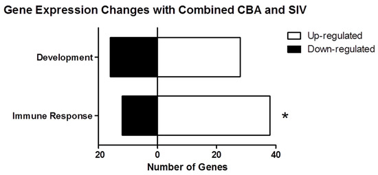 Number of genes involved in inflammatory and development processes that were up- and down-regulated. Immune processes include the set of genes from inflammation and immune response functions. The immune processes category had significantly more up-regulated genes than expected (76%) compared to the total number of up-regulated genes out of all differentially expressed genes (57%) (* p < 0.01, Chi-square test).