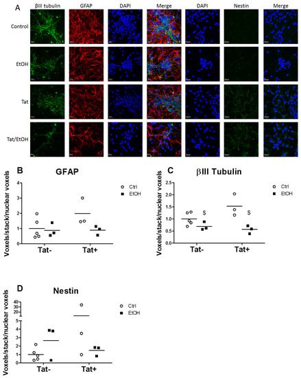 Panel (A) shows representative images from embryonic mouse neural progenitor cells (NPCs) treated with ethanol (EtOH) and/or trans-activator of transcription (Tat) on day one of proliferation and during four days of differentiation. Control staining is shown in the first row, EtOH in the second row, Tat in the third row, and Tat/EtOH in the fourth row. Quantification of immunofluorescence for each marker (βIII tubulin for neurons, glial fibrillary acidic protein (GFAP) for astrocytes, and nestin for neural progenitors) is shown in panels (B–D). Each symbol represents one experimental well. N = 5 for the control group and n = 3 for the experimental groups. Bar indicates the mean of each group. $ indicates main effect of alcohol (p < 0.05) by two-way ANOVA.