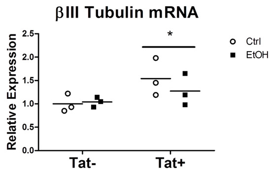 Relative βIII tubulin messenger ribonucleic acid (mRNA) expression in control (Ctrl) and EtOH treated NPCs with or without Tat. The solid line indicates the mean of each group. Data were analyzed by two-way ANOVA. N = 3 per group, * indicates p < 0.05 in Tat+ vs Tat-.
