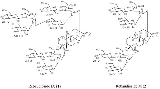 - Chaturvedula, V.S.P.; Upreti, M.; Prakash, I. Structures of the Novel α-Glucosyl Linked Diterpene Glycosides from Stevia rebaudiana. Carbohydr. Res. 2011, 346, 2034–2038. [Google Scholar] [CrossRef] [PubMed]