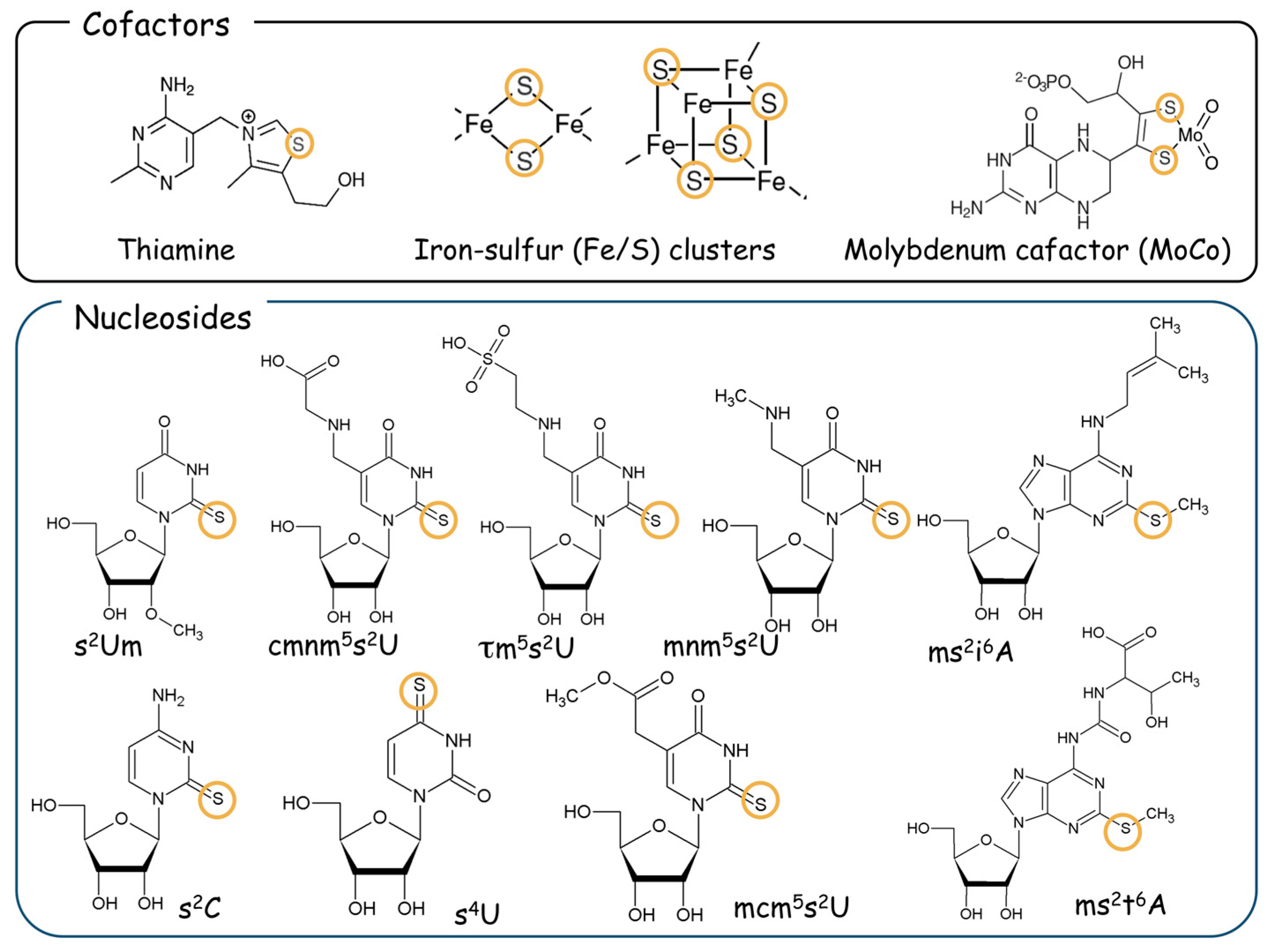 Sulfur-containing small molecules. Many biocofactors such as thiamine, iron-sulfur (Fe/S) clusters, and molybdenum cofactor (MoCo) contain sulfur atoms in their structure (upper column). Various sulfur-containing nucleosides are also identified. For example, the 2-thiocytidine derivatives are 2-thiocytidine (s2C) found in bacteria and 2-thio-2′-O-methyluridine (s2Um) found in humans. 4-thiouridine (s4U) is found in bacteria. Various types of the hyper-modified uridine, such as 5-carboxymethylaminomethyl-2-thiouridine (cmnm5s2U), 5-methylaminomethyl-2-thiouridine (mnm5s2U), 5-taurinomethyl-2-thiouridine (τm5s2U), and 5-methoxycarbonylmethyl-2-thiouridine (mcm5s2U) are found at U34. Various methylthio-adenosine derivatives, such as 2-methylthio- N6-isopentenyladenosine (ms2i6A) and 2-methylthio-N6-threonylcarbamoyladenosine (ms2t6A), are also found in both bacteria and eukaryotes. Sulfur atoms incorporated into the molecule in the biosynthetic pathway are shown with circles.