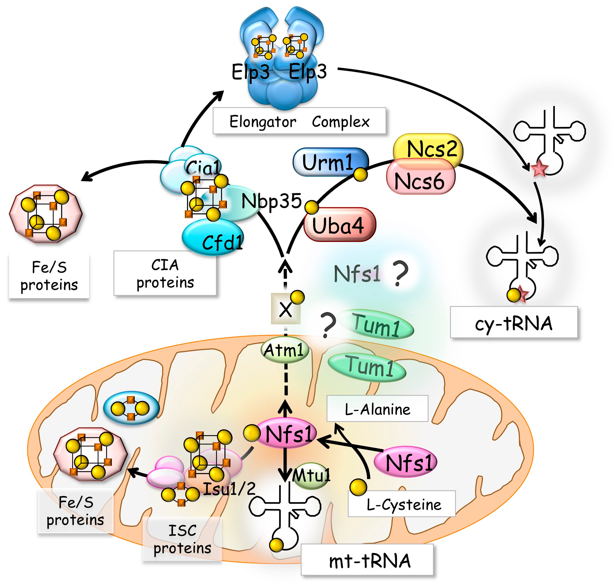 Involvement of the l-cysteine desulfurase Nfs1 in transfer RNA (tRNA) modification and iron-sulfur (Fe/S) cluster biosynthesis in Saccharomyces cerevisiae. The l-cysteine desulfurase Nfs1, identified as a member of the iron-sulfur cluster biogenesis (so-called “ISC”) proteins, is essential for the biogenesis of s2U34 in both cytosolic transfer RNAs (cy-tRNAs) and mitochondrial transfer RNAs (mt-tRNAs). Mtu1 is a mitochondrial tRNA-specific 2-thiouridylase. Comparing to the case of humans, existence of the cytosolic Nfs1 and the dual location of Tum1 are unclear in yeast (see text in detail). Cytosolic Fe/S protein maturation requires mitochondrial Nfs1 and the cytosolic iron-sulfur cluster assembly (so-called “CIA”) proteins, Cfd1, Nbp35, and Cia1. A putative unknown sulfur carrier to be exported from mitochondria via a membrane-bound protein Atm1 is shown as X. Elongator complex function as a dimer of the complex of Elongator complex 1-6 (ELP1-6) proteins, and function in the C5 modification (marked with a star) of U34. Both a cytosolic ubiquitin-like protein (UBL), ubiquitin-related modifier 1 (Urm1), and its partner sulfurtransferase, ubiquitin-activating enzyme-like protein 4 (Uba4), are required for the formation of s2U34 in cy-tRNAs. Ncs6 and Ncs2 are also involved in the s2U34 formation in cy-tRNAs. The sulfur atoms delivered to the iron-sulfur (Fe/S) clusters and s2U34 in both mitochondrial (mt-) and cytosolic (cy-) tRNAs are shown with filled circles. Fe atoms of Fe/S clusters are shown with filled squares. See text in detail.