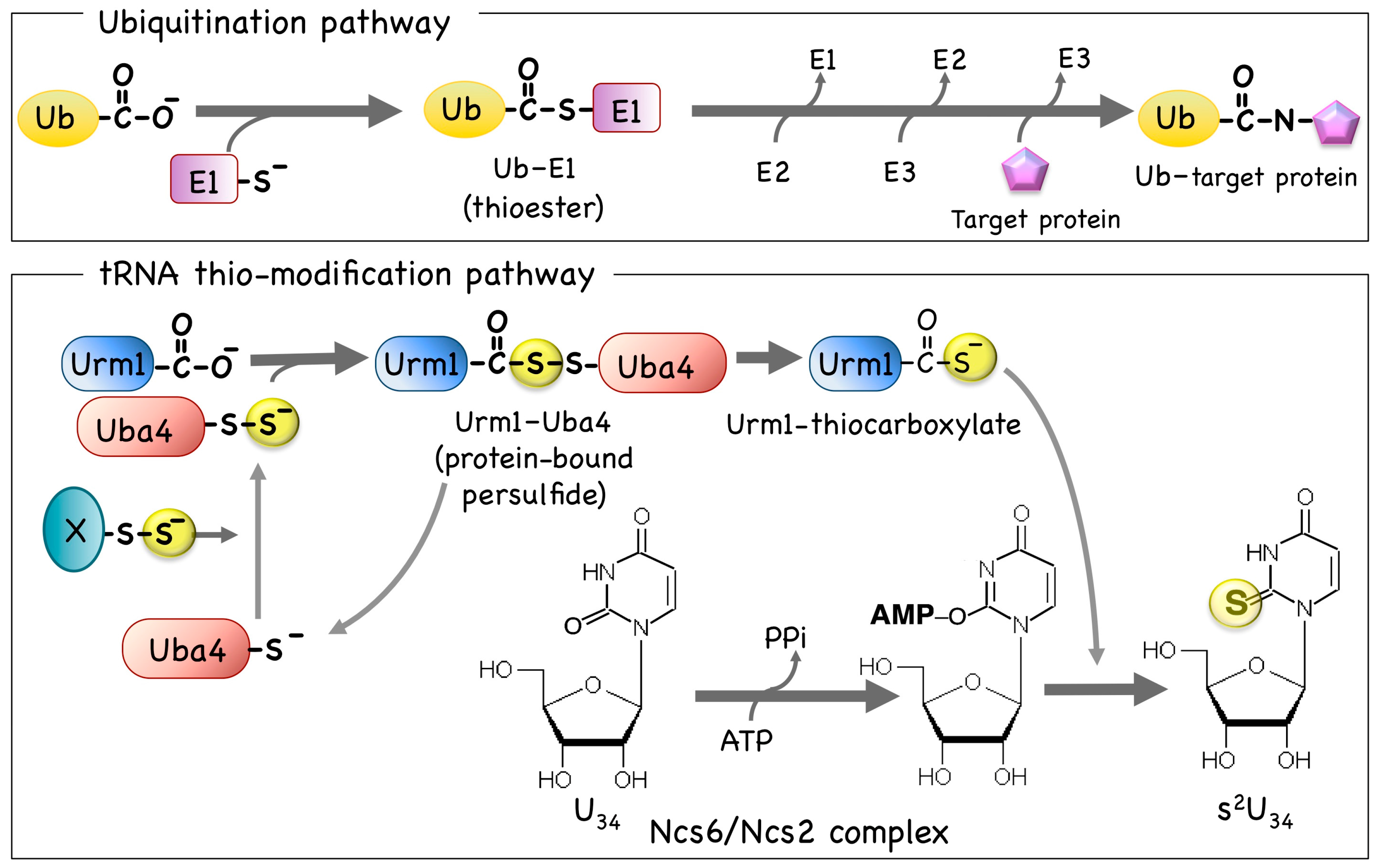 The UBL—ubiquitin-activating enzyme (E1)-like protein system related to the thio-modification of cytosolic transfer RNA (tRNA). The protein modifier system of ubiquitination found in eukaryotes (upper column) is compared with a plausible model for the sulfur transfer between Uba4 and Urm1, which is for the s2U34 formation in yeast cytosolic tRNA (lower column). In the ubiquitination pathway, ubiquitin (Ub) is first bound to the UBA protein E1 (a sulfhydryl of an active cysteine residue is shown in a yellow circle) and then, after several reactions, is finally bound to form a thioester bond. In the thio-modification pathway, a UBL protein Urm1 is first bound to the partner UBA protein, Uba4. A complex of Ncs6 and Ncs2 (the Ncs6/Ncs2 complex) is thought to be involved in the last step of the tRNA recognition and thio-modification of cy-tRNAs. Sulfur atoms transferred in this system are shown with filled circles.