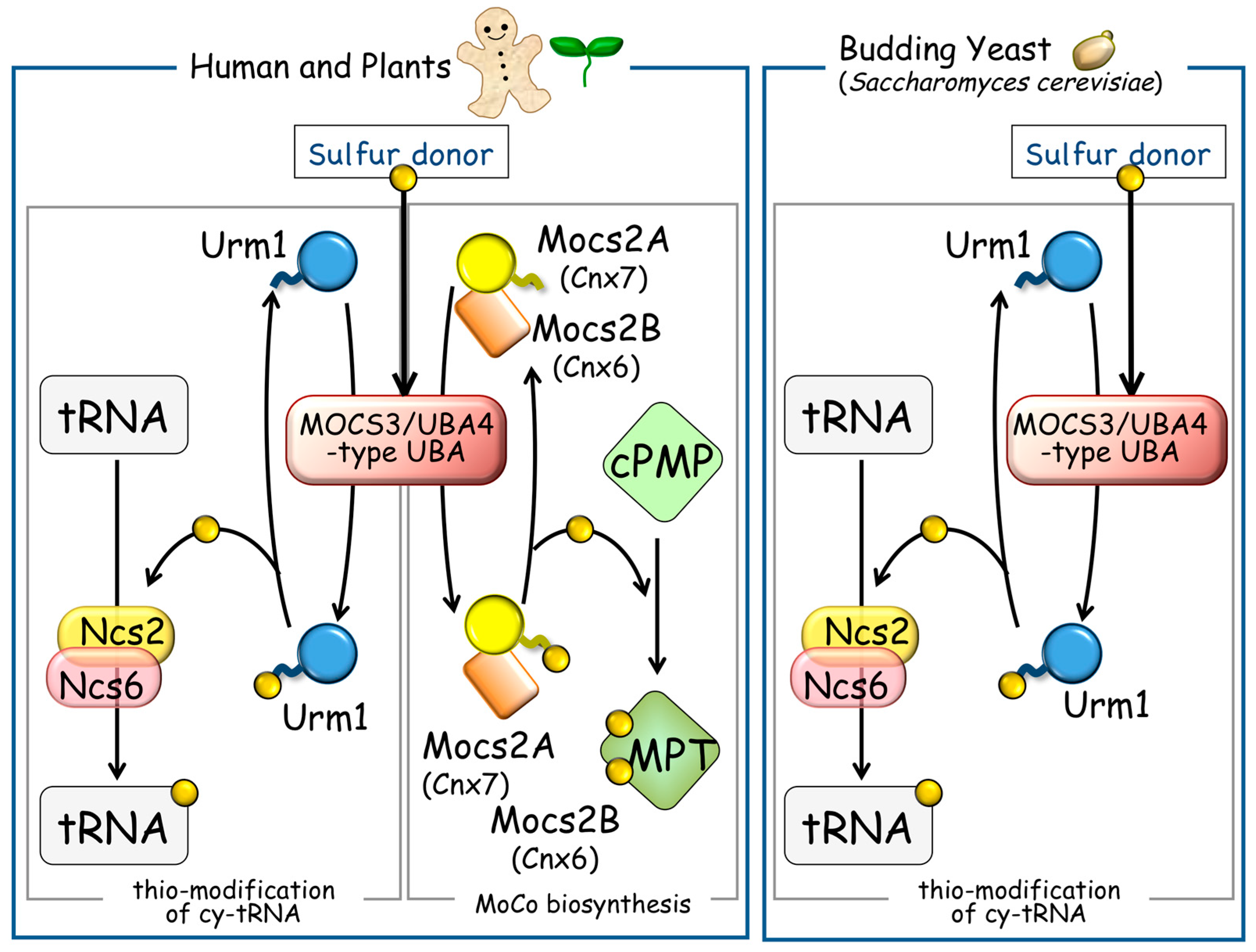 Sulfur delivery to the U34 in cy-tRNAs and for molybdopterin (MPT) biosynthesis in eukaryotes. Multicellular eukaryotes (human and plant) possess two types of ubiquitin-like (UBL proteins, for MoCo biosynthesis, and for the thio-modification of tRNA, both of which associate with the common Uba4/MOCS3-type UBA proteins (left panel). On the other hand, the yeast Saccharomyces cerevisiae contains no MoCo biosynthesis-related proteins and only Urm1 for thio-modification of tRNAs associates to Uba4 (right panel). Sulfur atoms to be delivered are shown with filled circles.