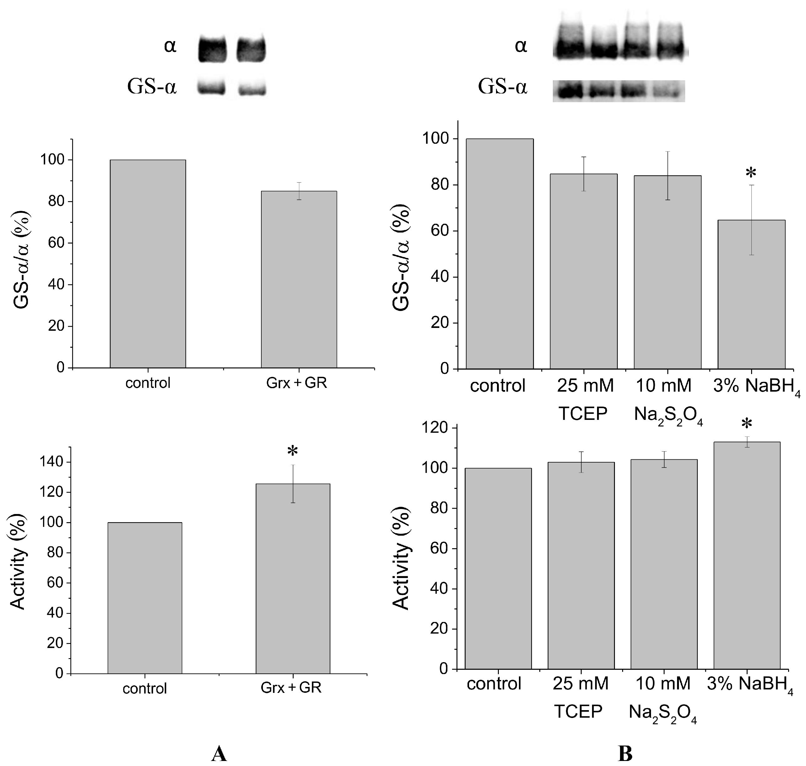 In order to achieve complete deglutathionylation of the α1-subunit, we treated the enzyme with chemical reducing agents under denaturing conditions (in the presence of 8% sodium dodecyl sulfate (SDS) and 8 M urea at 37 °C). However, even under these conditions deglutathionylation of the α1-subunit was partial, not exceeding 50% (