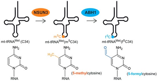 The methyltransferase NSUN3 has been identified as responsible for the first step of the process of f5C formation, namely, the methylation of carbon 5 to form methylcytosine (m5C). NSUN3 belongs to the family of NOL1/NOP2/Sun (NSUN) domain-containing proteins. Other members of this family of putative RNA methyltransferases have been shown to methylate cytosolic tRNA (NSUN2 and NSUN6) [37,38], cytosolic rRNA (NSUN1/NOP2, NSUN5) [39,40] or mitochondrial rRNA (NSUN4) [41,42].