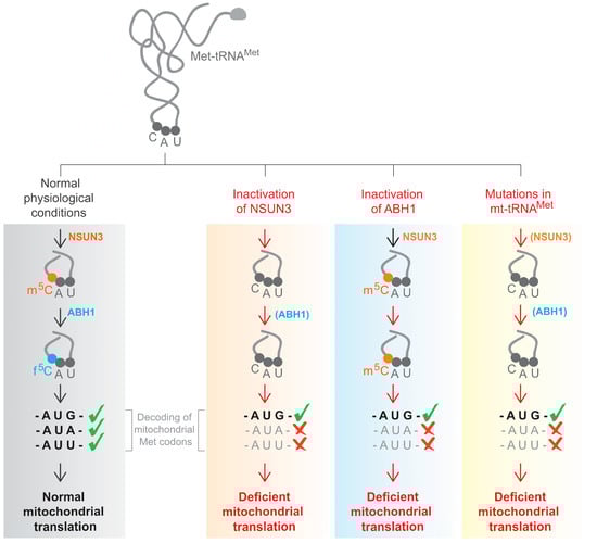 Although current evidence supports a role for f5C in recognition of both the AUG and AUA codon in both the ribosomal A- and P-site, the exact function has yet to be elucidated. Nonetheless, severe impairment of de novo mitochondrial translation, with a consequent defect in oxygen consumption rate, was consistently observed upon inactivation of NSUN3 or ABH1 [33,34,35]. Therefore, the analysis of cells with the deficiency of NSUN3 or ABH1 has provided the first evidence for a physiological role of f5C34 in mt-tRNAMet in living cells.