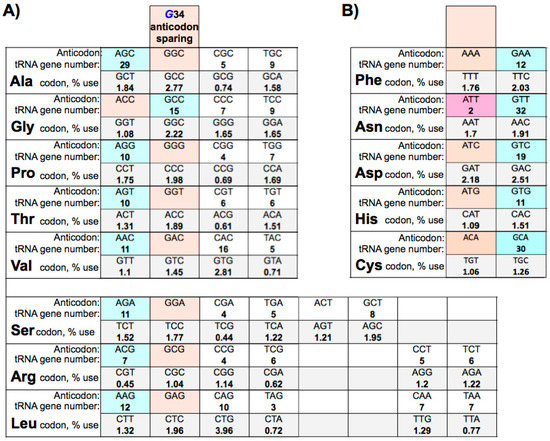 - Marck, C.; Grosjean, H. tRNomics: Analysis of tRNA genes from 50 genomes of Eukarya, Archaea, and Bacteria reveals anticodon-sparing strategies and domain-specific features. RNA 2002, 8, 1189–1232. [Google Scholar] [CrossRef]