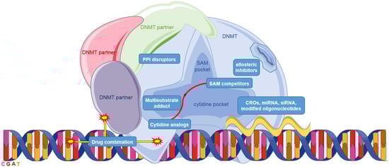 Schematic representation of different DNA methyltransferase (DNMT)-inhibition approaches. DNMT: DNA methyltransferase; PPI: protein–protein interaction; SAM: S-adenosyl-L-methionine; CRO: chimeric RNA oligonucleotides; miRNA: micro RNA; siRNA: small interfering RNA.