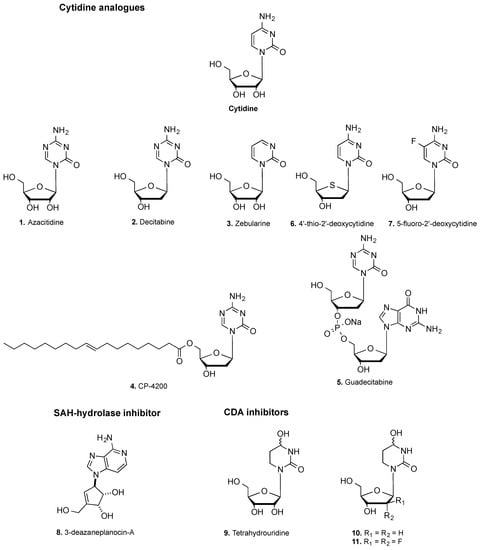 Structures of nucleoside DNMT, S-adenosyl-L-homocysteine (SAH)-hydrolase and cytidine deaminase (CDA) inhibitors.