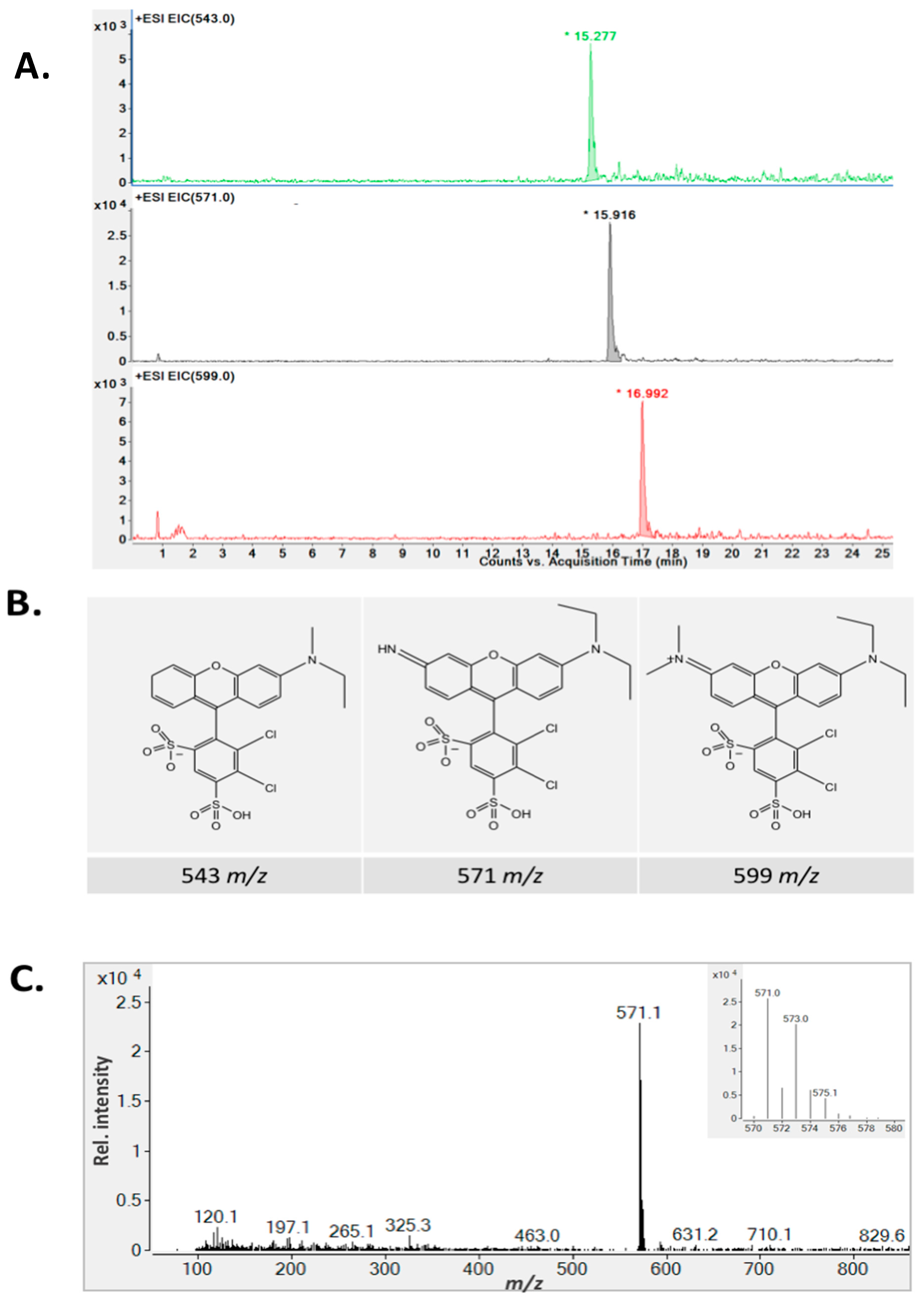 - Gosetti, F.; Bolfi, B.; Marengo, E. Identification of Sulforhodamine B photodegradation products present in nonpermanent tattoos by micro liquid chromatography coupled with tandem high-resolution mass spectrometry. Anal. Bioanal. Chem. 2015, 407, 4649–4659. [Google Scholar] [CrossRef] [PubMed]