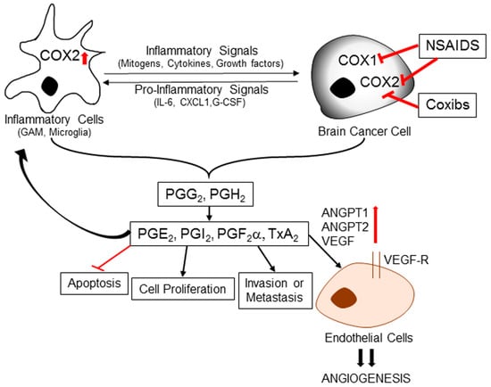 Several brain cancer studies found COX-2 overexpression and its strong correlation with the tumor grade. In comparison to healthy brain or low-grade glioma, the COX-2 levels are much higher in high-grade gliomas as confirmed by immunohistochemical staining. Moreover, elevated COX-2 levels correlate with earlier recurrence and shorter survival in glioma patients, [90]. According to Shono et al. high COX-2 levels are markers of poor prognosis in brain cancer patients especially those with GBM. Though, how exactly COX-2 contributes to brain cancer pathogenesis is still unclear, many studies have confirmed a direct correlation between COX-2 level and metastatic and invasive potential of brain cancer cells. COX-2 can promote EMT by stimulating the release of proangiogenic prostaglandins. These observations implicate that along with the promotion of inflammatory conditions in tumor microenvironment COX-2 is involved in multiple other tumorigenic mechanisms in brain cancer development (Figure 2).