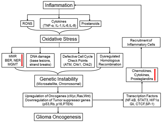 Inflammation, oxidative stress, and chromosomal instability: a vicious cycle that promotes brain tumorigenesis. Inflammatory cells produce various reactive oxygen and nitrogen species (RONS) and other factors, such as cytokines, chemokines, and prostanoids. All these mediators promote oxidative stress in cells leading to deregulated DNA repair systems MMR (DNA mismatch repair), NER (nucleotide excision repair), BER (base excision repair), and MGMT), increased DNA damage, defective cell cycle checkpoints, and dysregulated homologous recombination (HR) pathway. Oxidative stress-induced MMR silencing often causes formation of error-prone microsatellites in the coding regions of various genes and repeated DNA sequences, termed as microsatellite instability (MSI). RONS-mediated DNA damage and strand breaks along with abnormal mitotic checkpoints and homologous recombination (HR) collectively engender genetic instability (GI). Both MSI and GI can spawn random genetic diversification in precancerous cells. Clones harboring the optimal combination of activated oncogenes and inactivated tumor suppressor genes will eventually proceed to initiate malignancy. Upon activation, some oncogenes may turn on the transcription factors like NF-κB, STAT3, and HIF-1α, followed by production of pro-inflammatory cytokines and chemokines.