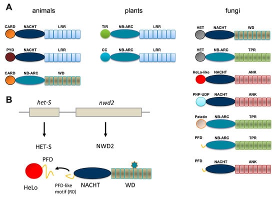 Domain organization of Nod-like receptor (NLR) and NLR-like proteins in animals, plants and fungi. (A) The most common domain organization for Nod-like (or NB-leucine-rich repeat (LRR)) proteins and related proteins in animals, plants and fungi are listed. The animal group includes the APAF-1 regulator of the intrinsic apoptosis pathway (bottom diagram). Only a selection of the more common domain-architectures is given. (B) Genome organization and domain diagram of the nwd2/het-s gene cluster of Podospora anserina. The star-shaped figure represents the cognate ligand of the NWD2 repeat domain.